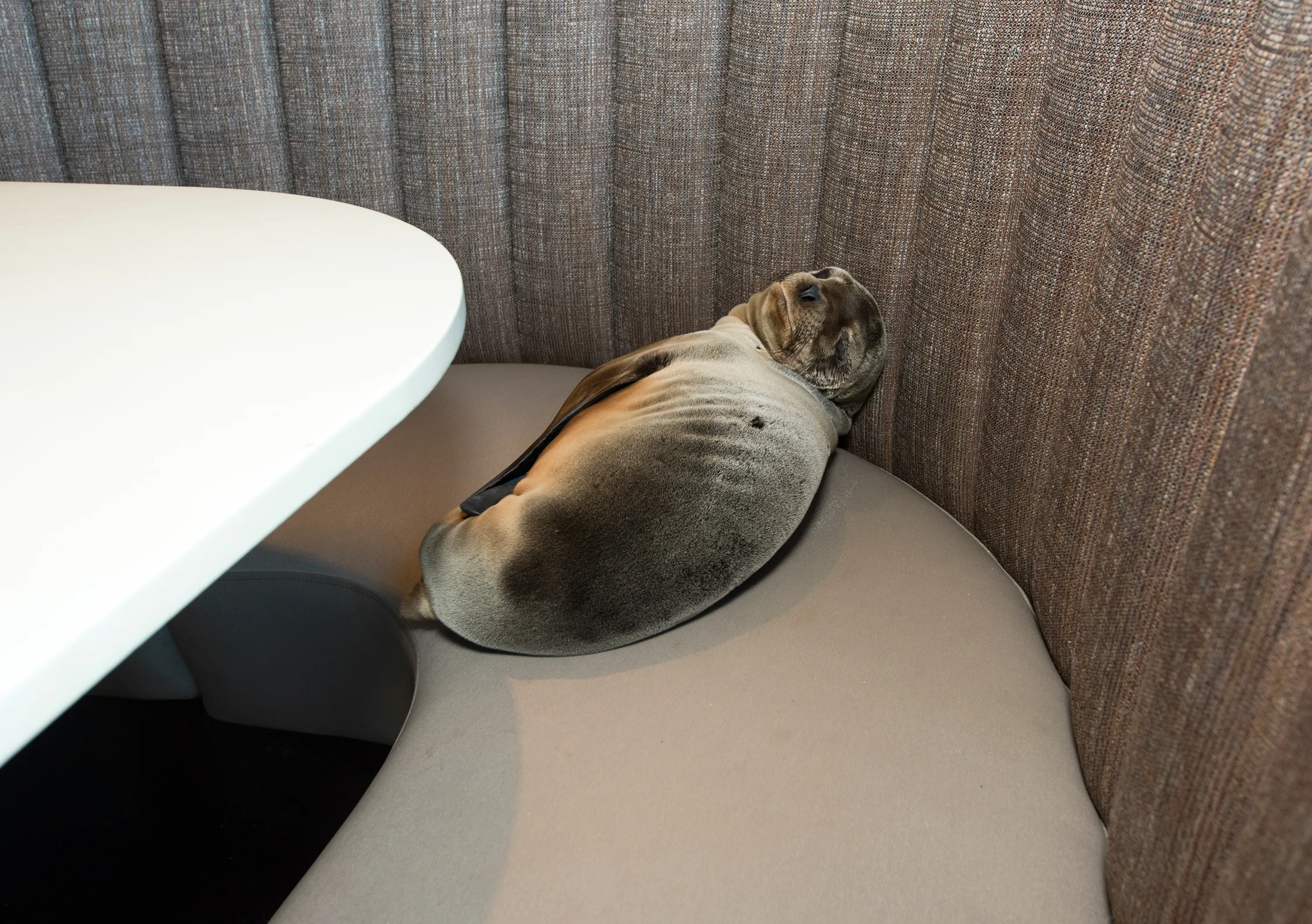 In a photo provided by SeaWorld, an 8-month-old female sea lion pup is shown where it was found sleeping in a booth of the Marine Room, an upscale restaurant in the La Jolla neighborhood of San Diego, Thursday, February 4, 2016. Experts were called from nearby SeaWorld, who said the pup was severely underweight and dehydrated. The pup was taken to SeaWorld�s Animal Rescue Center and experts are cautiously optimistic about her recovery. There�s been a surge in sea lion mortality over the past year because, scientists say, the animals� food supply has been affected by higher-than-normal ocean temperatures linked to El Nino. (Photo by Mike Aguilera/SeaWorld via AP Photo)