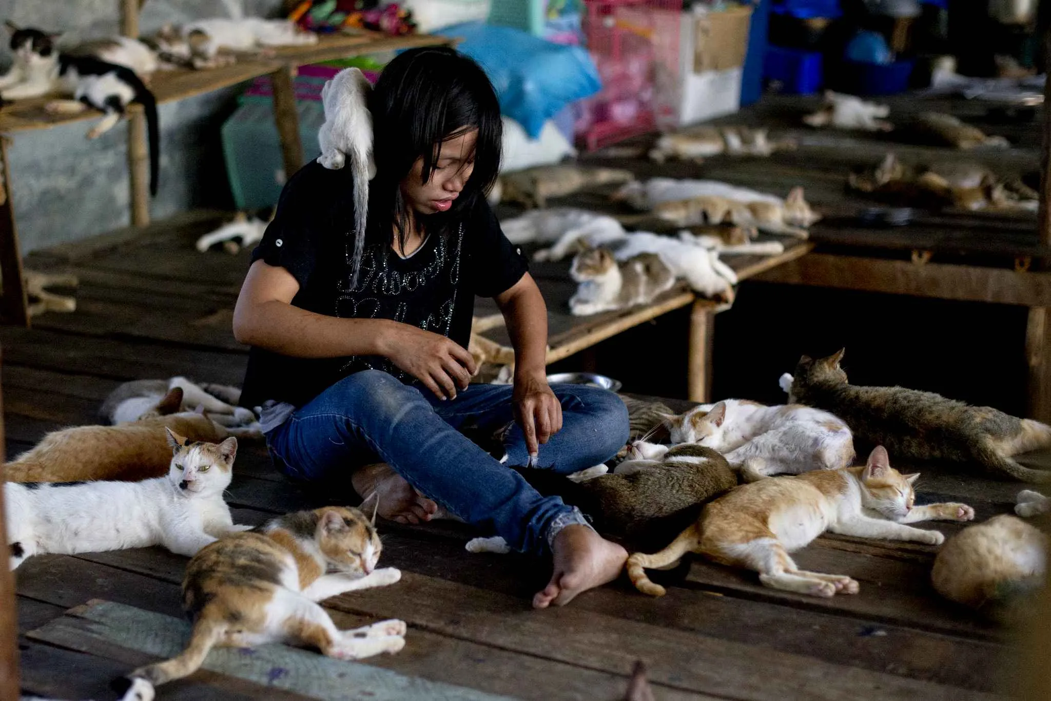 This photo taken on February 4, 2016 shows a woman treating cats at a shelter on the outskirts of Yangon. The shelter houses over 200 animals and are provided food and basic medical treatments which owners say were rescued from Yangon streets. (Photo by Ye Aung Thu/AFP Photo)