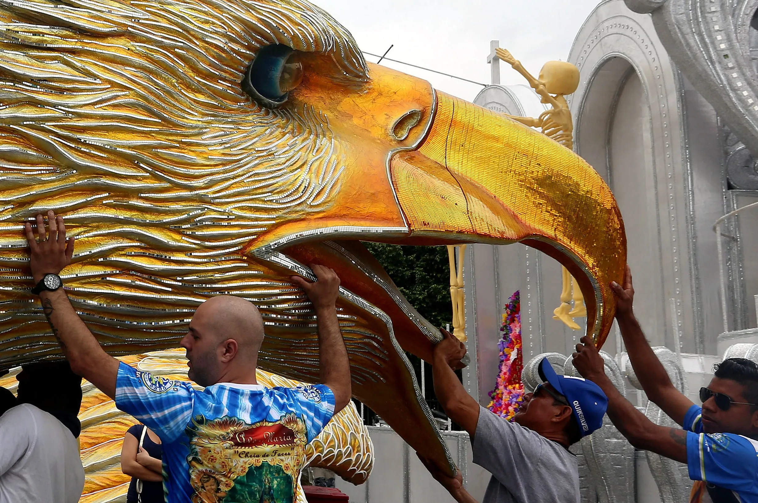 Men work to complete carnival floats in São Paulo, Brazil on February 4, 2016. (Photo by Rahel Patrasso/Xinhua Press/Corbis)