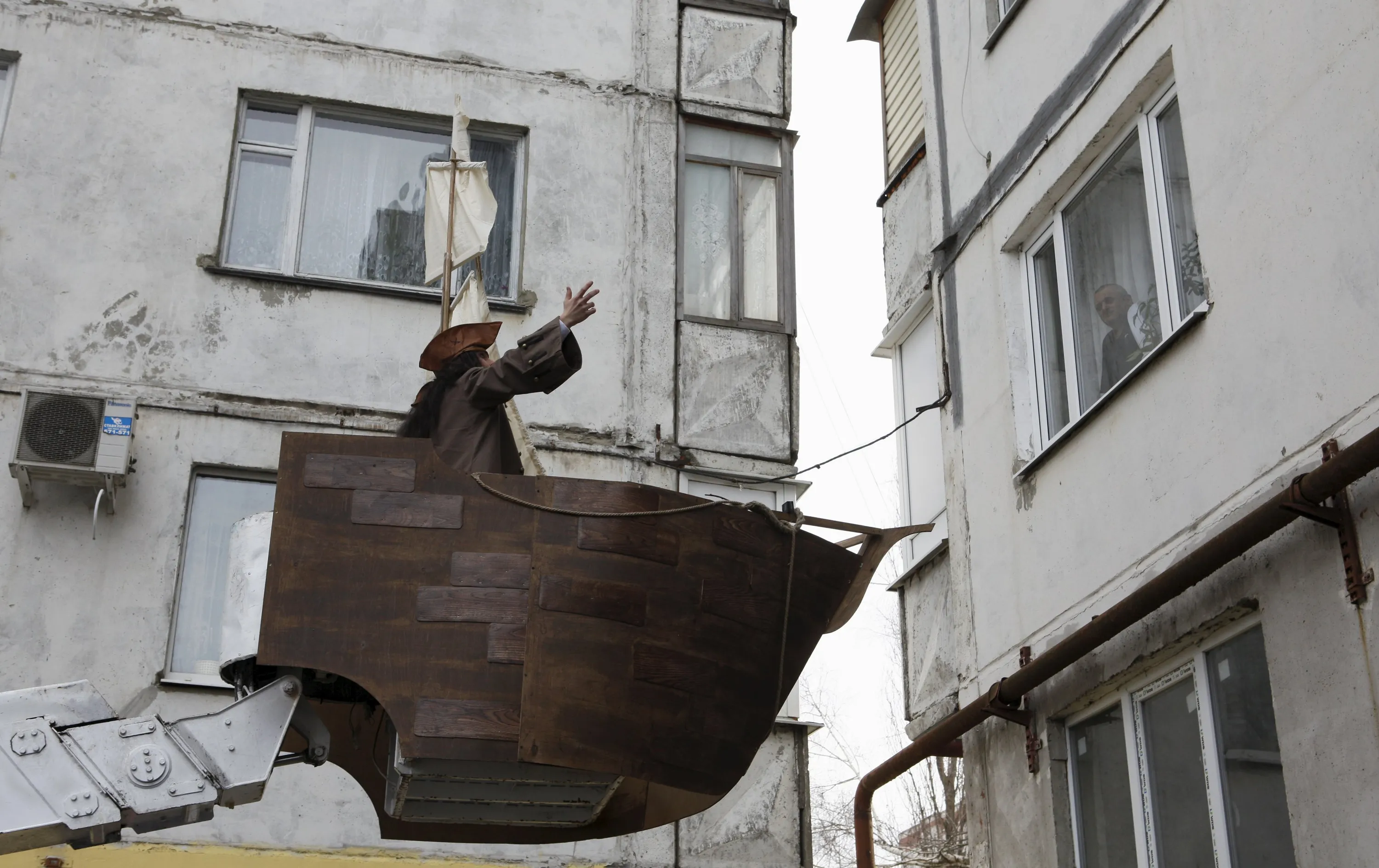 German Yesakov, 25, a cameraman from Russia, goes up in a lifting platform decorated as a sailing ship dressed as movie character Captain Jack Sparrow, during his wedding ceremony in the southern city of Stavropol, Russia, February 5, 2016. (Photo by Eduard Korniyenko/Reuters)