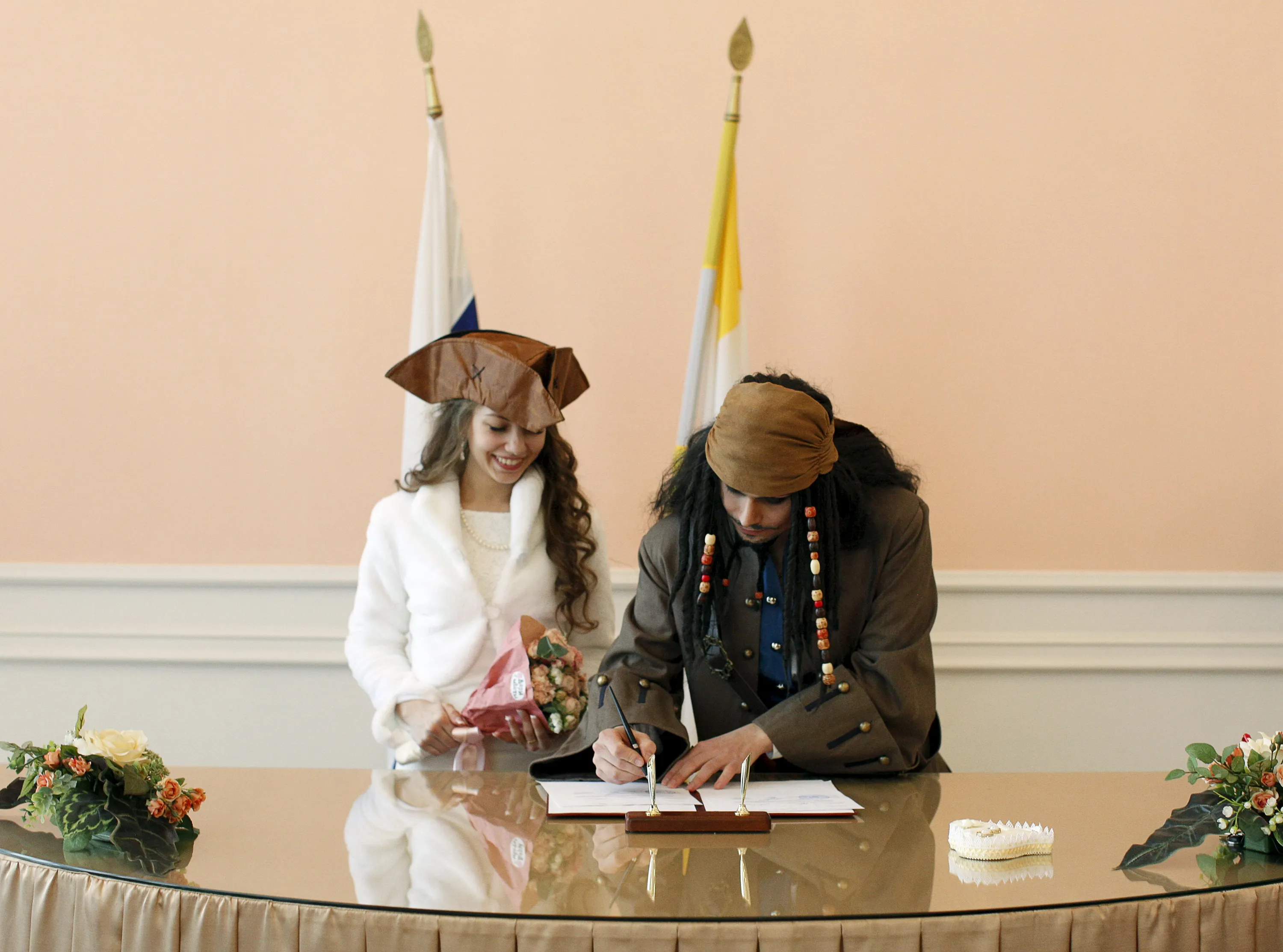 German Yesakov, 25, a cameraman from Russia, dressed as movie character Captain Jack Sparrow, and his bride Anastasiya sign marriage documents during their wedding ceremony in the southern city of Stavropol, Russia, February 5, 2016. (Photo by Eduard Korniyenko/Reuters)