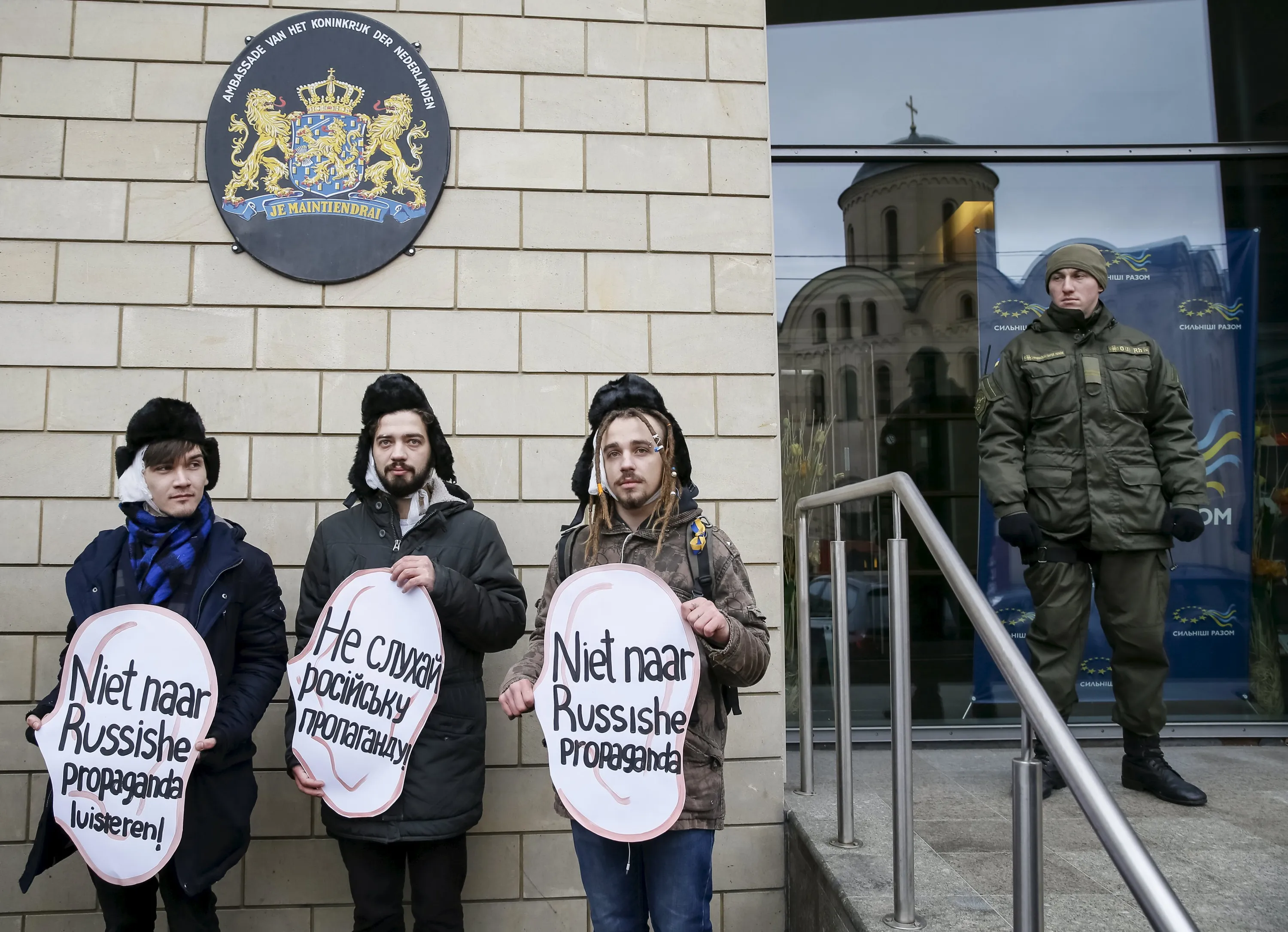 Activists dressed as the Dutch artist Vincent van Gogh demonstrate outside the Dutch embassy in Kiev, Ukraine, February 5, 2016. They demanded that Dutch people ignore what they say are Russian propaganda, ahead of an upcoming Dutch Ukraine-European Union Association Agreement. The signs read, “Don't listen to Russian propaganda”. (Photo by Gleb Garanich/Reuters)