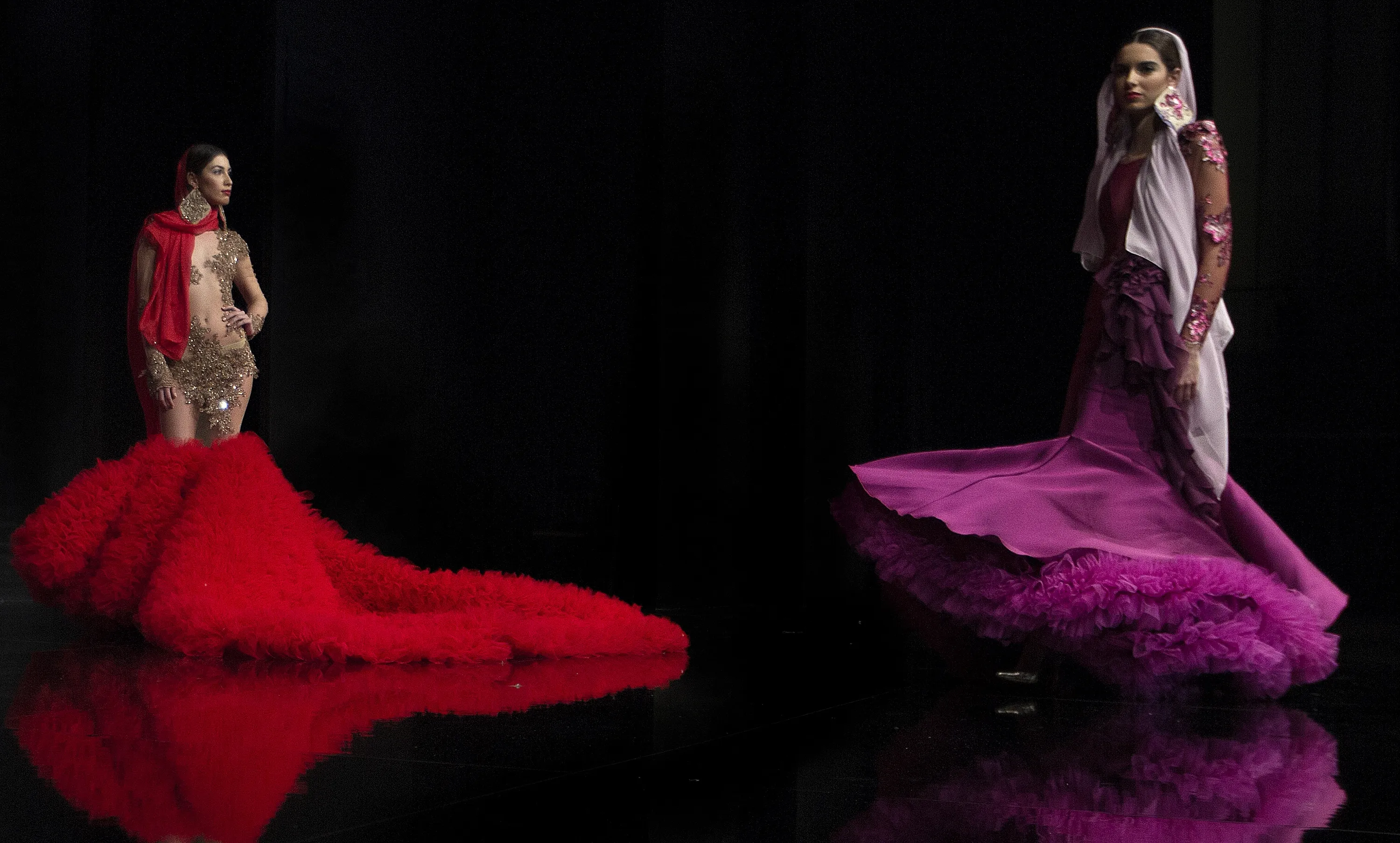 Models present creations by designer Alejandro Santizo during the International Flamenco Fashion Show in Seville, Spain, Friday, February 5, 2016. Santizo is a new designer emerging this year with this dramatic vibrant look designed around the traditional Flamenco art. (Photo by Miguel Angel Morenatti/AP Photo)