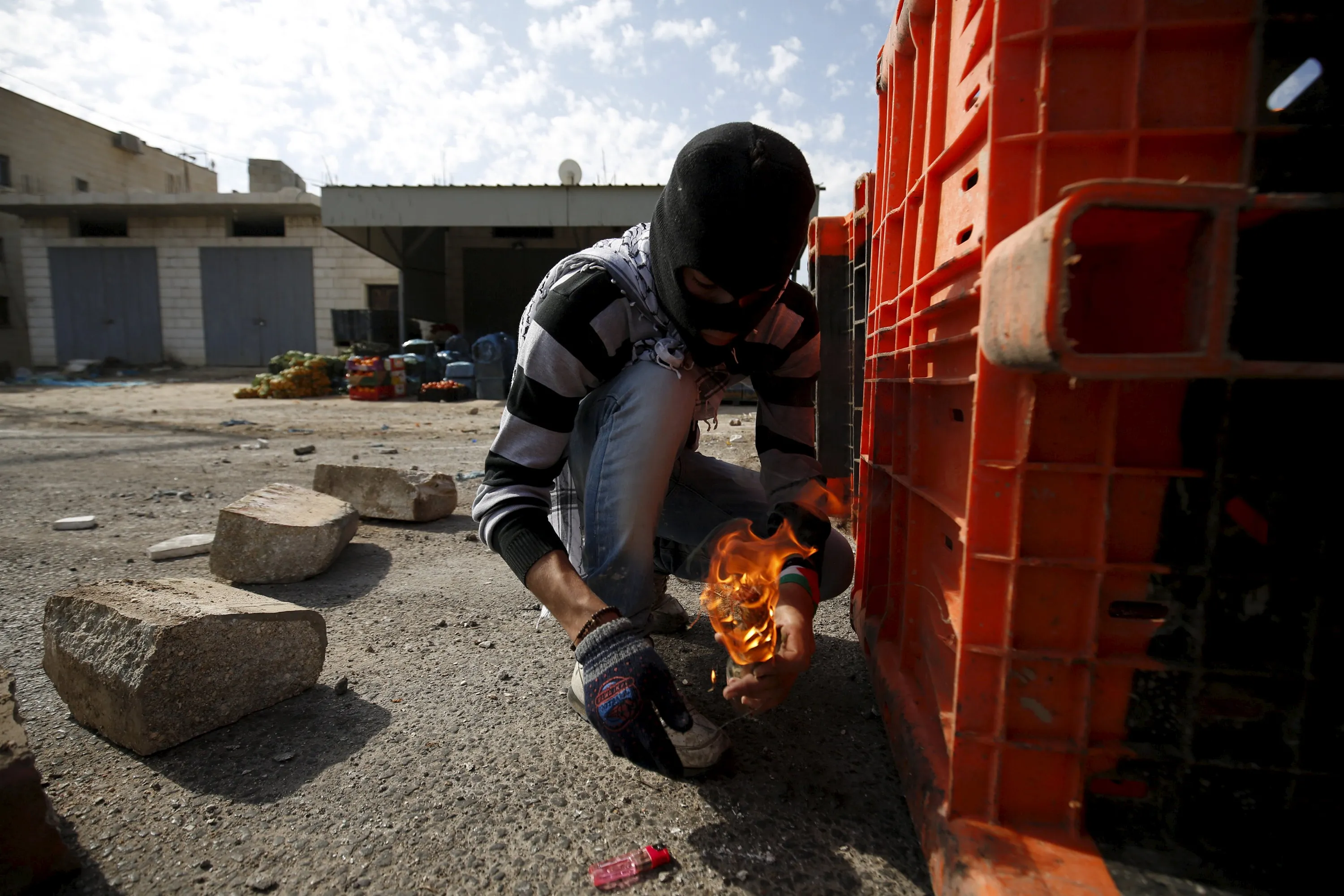 A Palestinian protester prepares a molotov cocktail to be hurled towards Israeli troops during clashes in the West Bank town of Qabatya, near Jenin February 5, 2016. (Photo by Mohamad Torokman/Reuters)