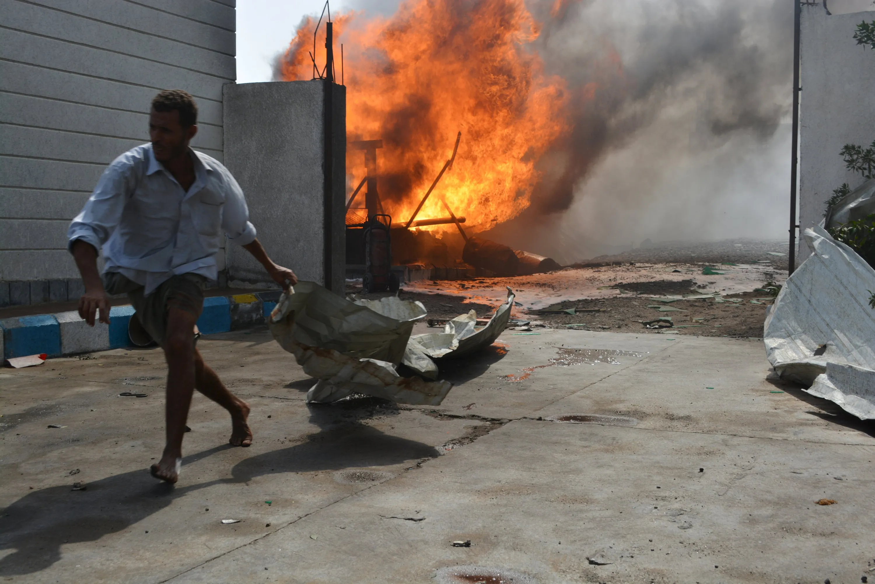 A man drags a piece of metal from a petrol station after it was hit by a Saudi-led air strike in Yemen's Red Sea port city of Houdieda February 5, 2016. (Photo by Abduljabbar Zeyad/Reuters)