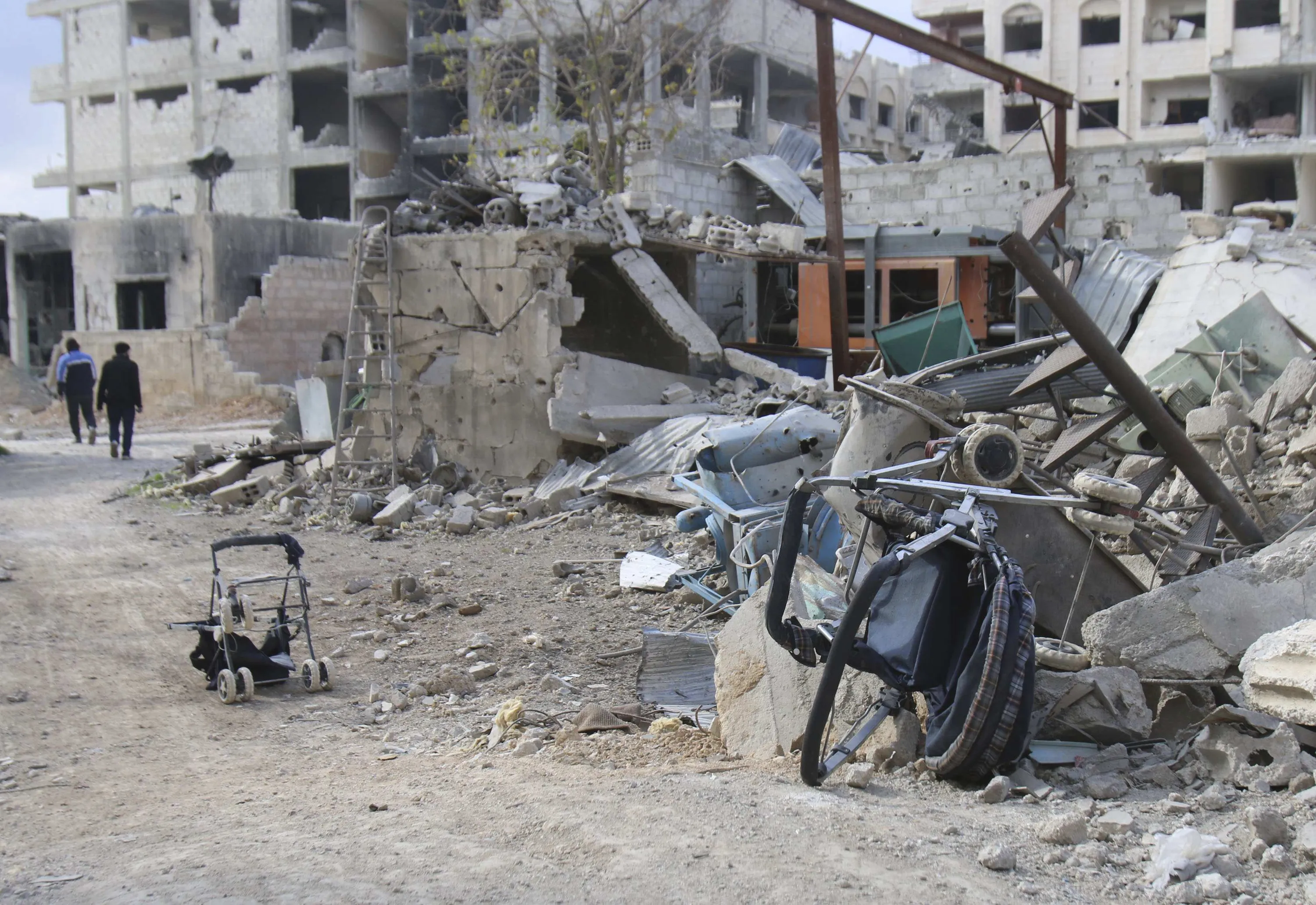 Baby strollers are seen near the debris of damaged buildings in Jobar, a suburb of Damascus, January 5, 2015. (Photo by Diaa Al-Din/Reuters)