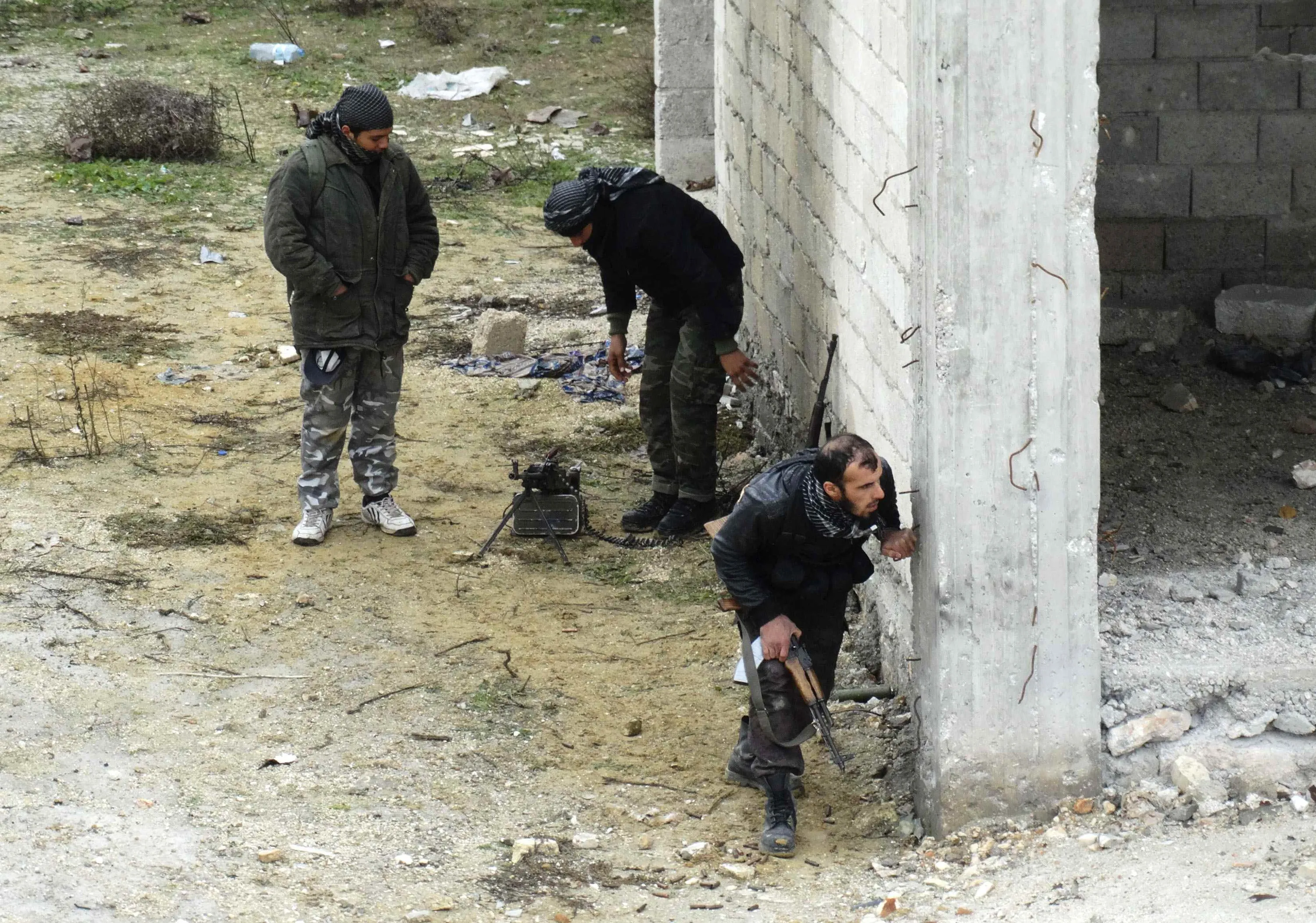 Rebel fighters take positions as one of them peers out from behind a wall at al-Breij frontline, after what they said was an advance by them in al-Manasher and al-Majbal areas where forces loyal to Syria's President Bashar al-Assad were stationed, in Aleppo January 5, 2015. (Photo by Abdalghne Karoof/Reuters)