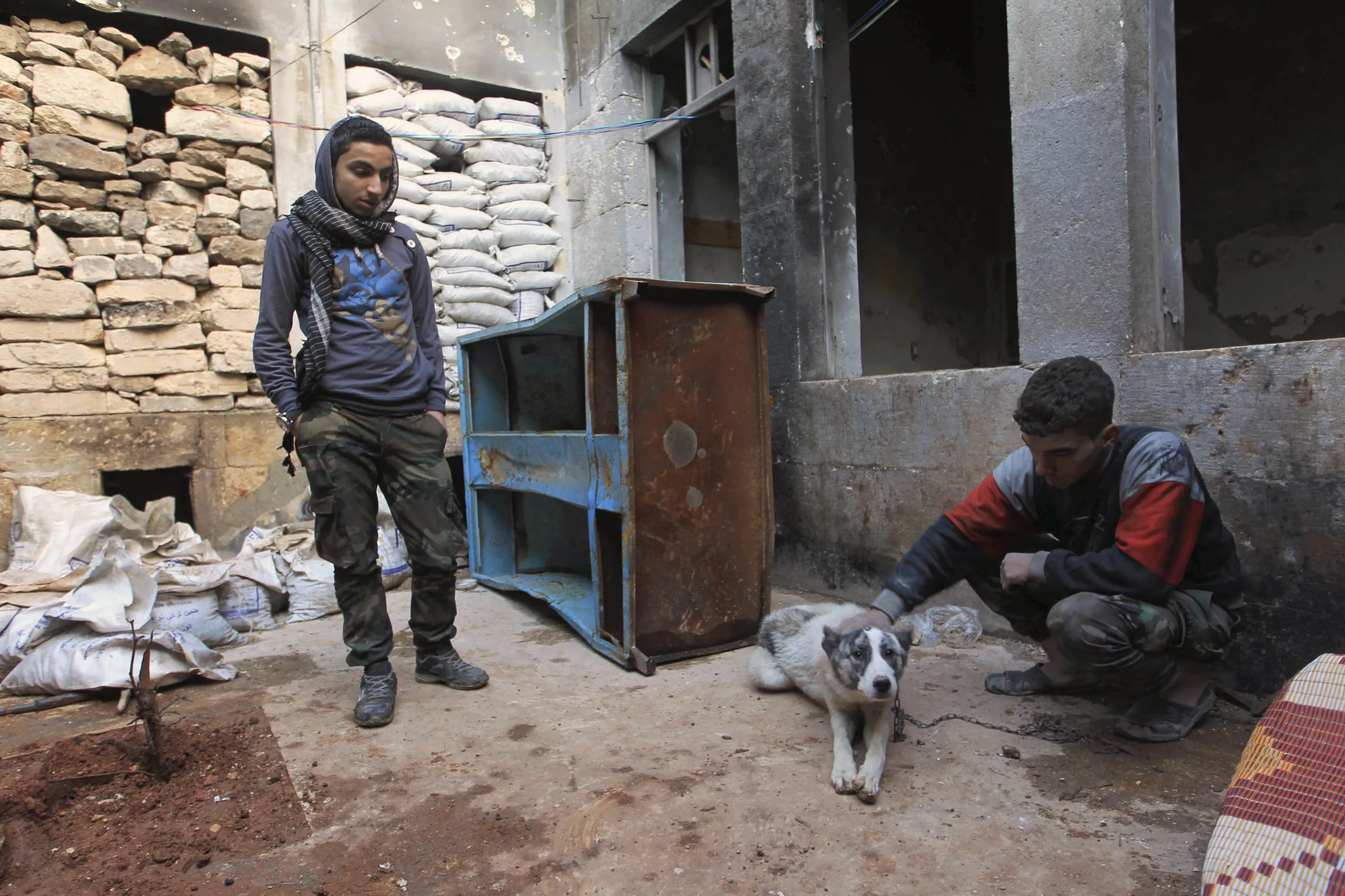A rebel fighter pets a dog as a fellow fighter watches near the frontline against forces loyal to Syria's President Bashar al-Assad in Aleppo January 8, 2015. (Photo by Jalal Al-Mamo/Reuters)