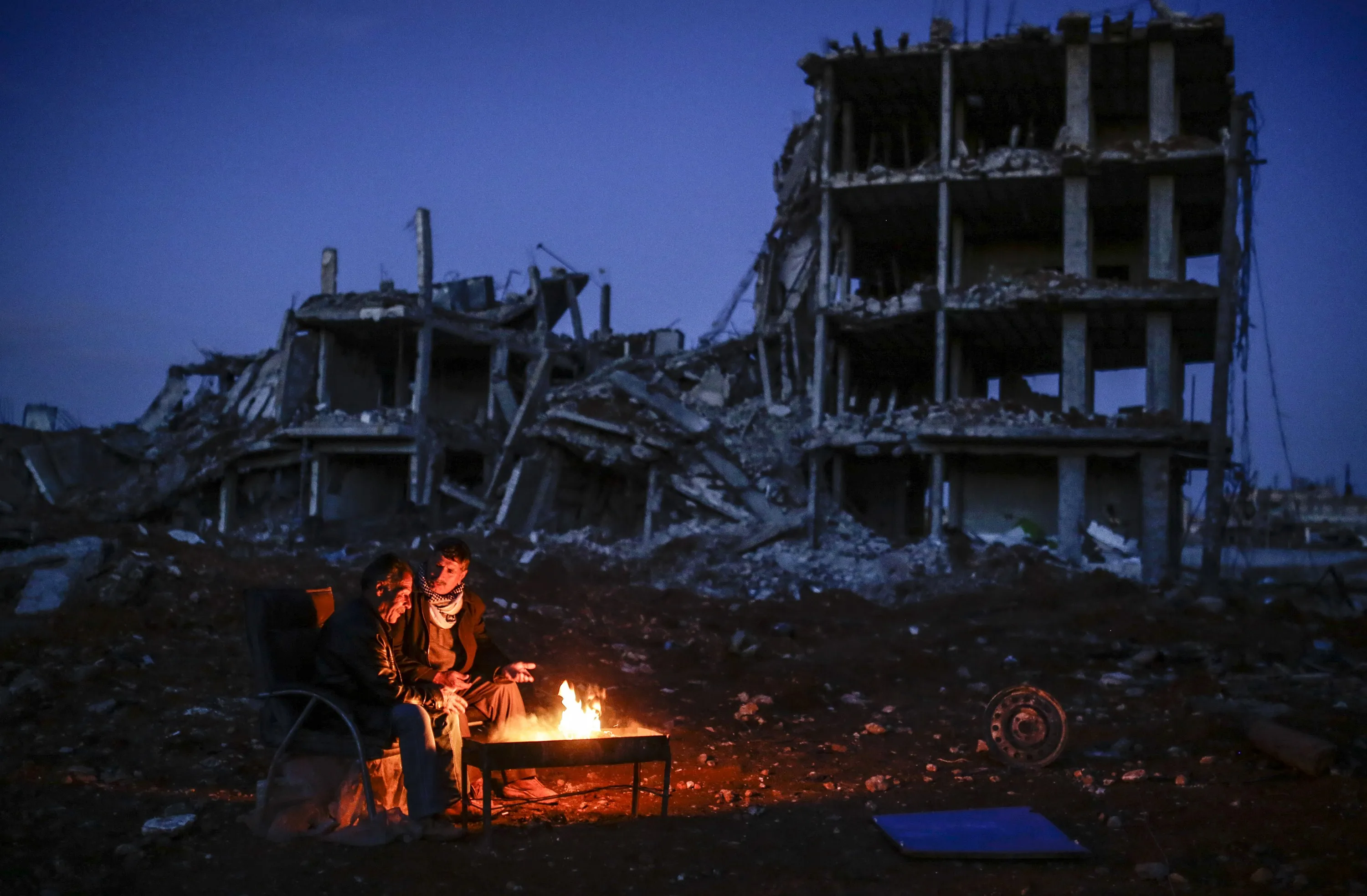 Kurdish men sit near bonfire near a destroyed building, in the Syrian Kurdish town of Kobane, also known as Ain al-Arab, on March 22, 2015. (Photo by Yasin Akgul/AFP Photo)