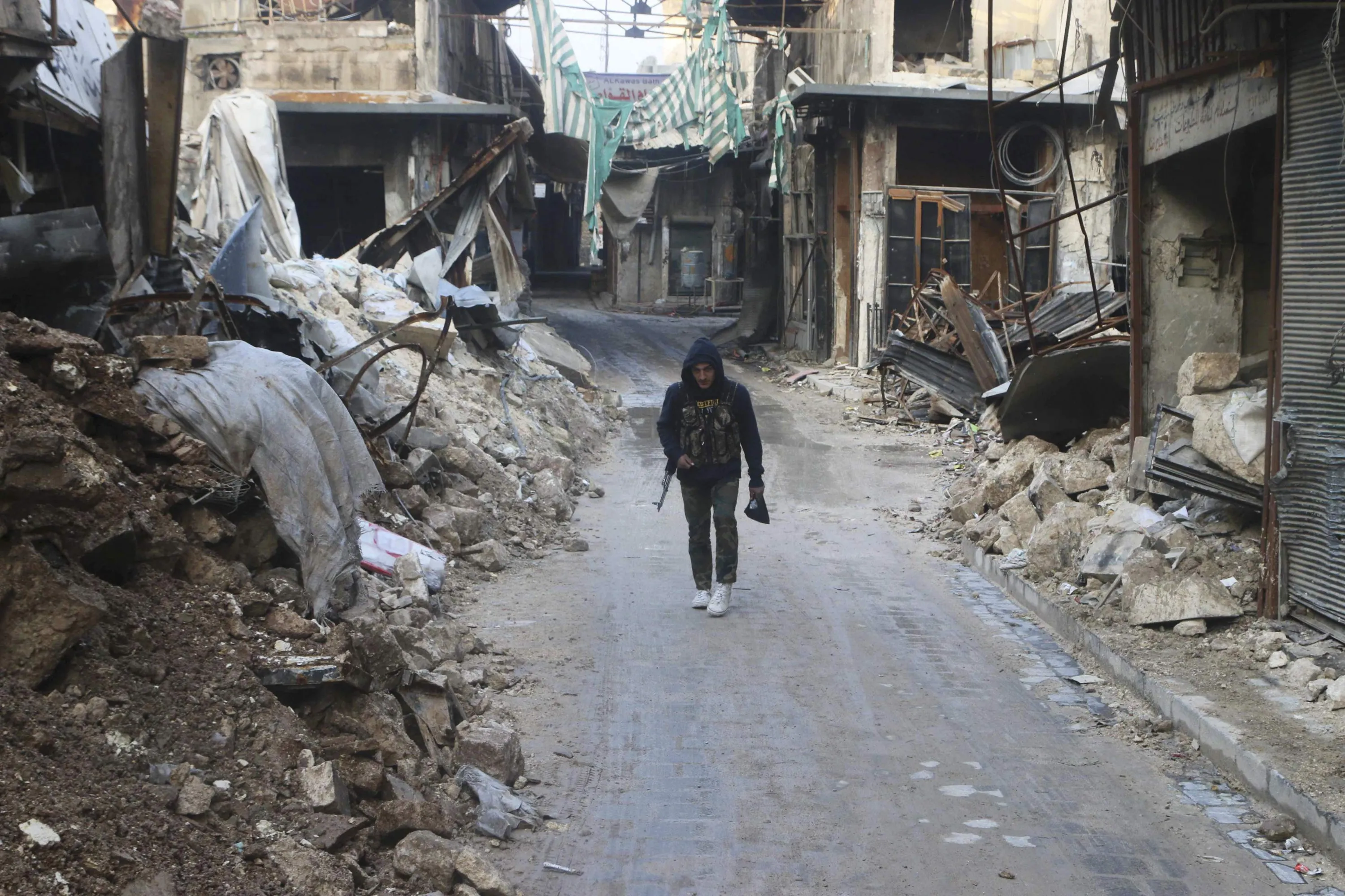 A Free Syrian Army fighter walks with his weapon amid damaged buildings in Old Aleppo January 17, 2015. (Photo by Abdalrhman Ismail/Reuters)