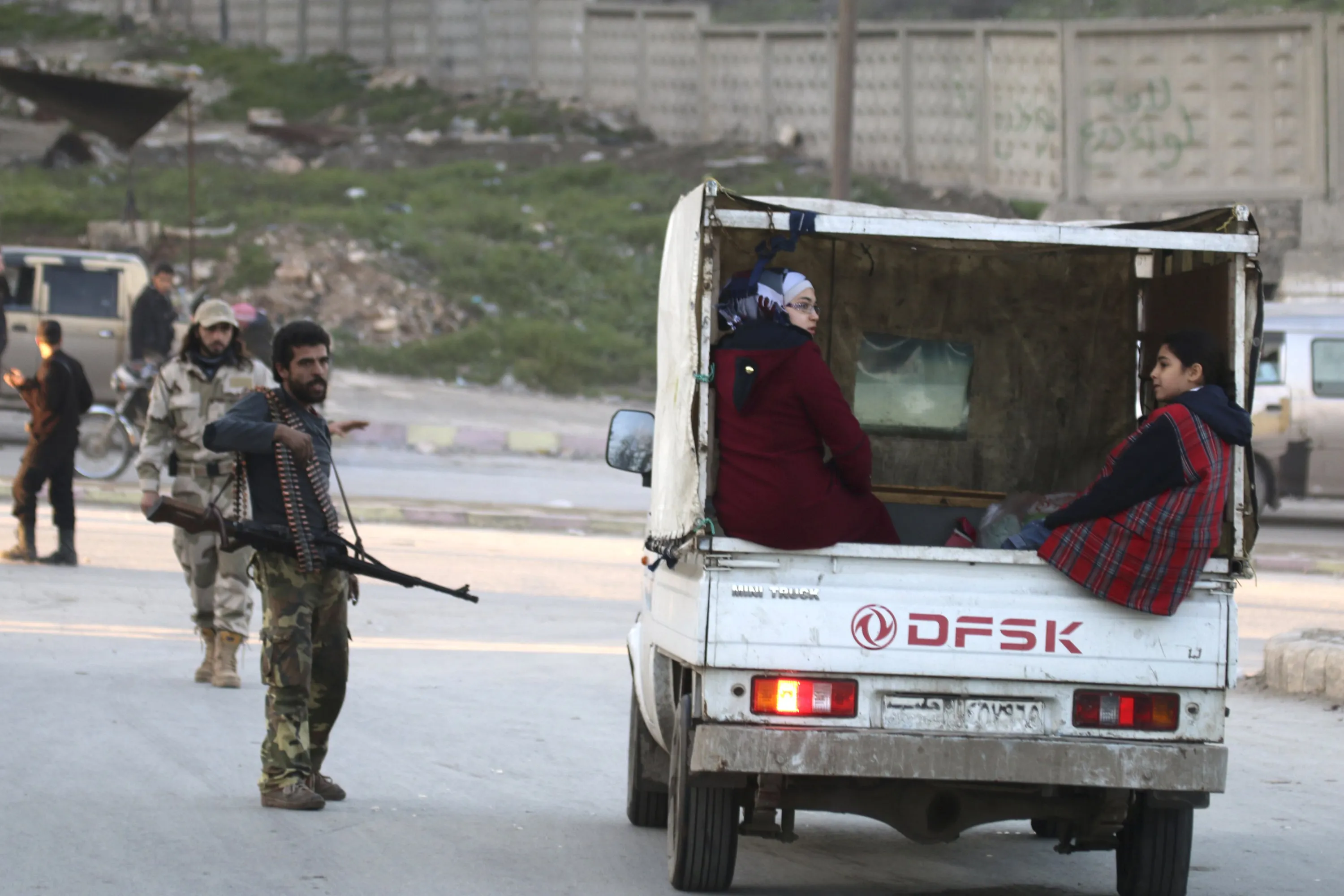Women sit on the back of a pick-up truck as they stop on a Shamiya Front fighters checkpoint in Al-Ansari neighborhood of Aleppo January 23, 2015. (Photo by Ammar Abdullah/Reuters)