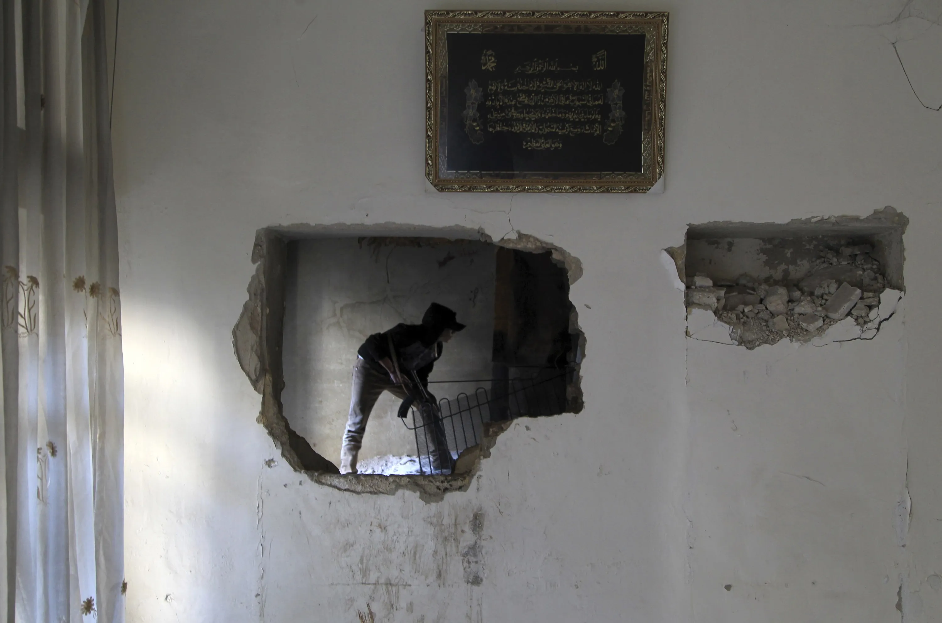A rebel fighter is seen through a hole in a wall as he takes a position in the old city of Aleppo January 26, 2015. (Photo by Jalal Al-Mamo/Reuters)