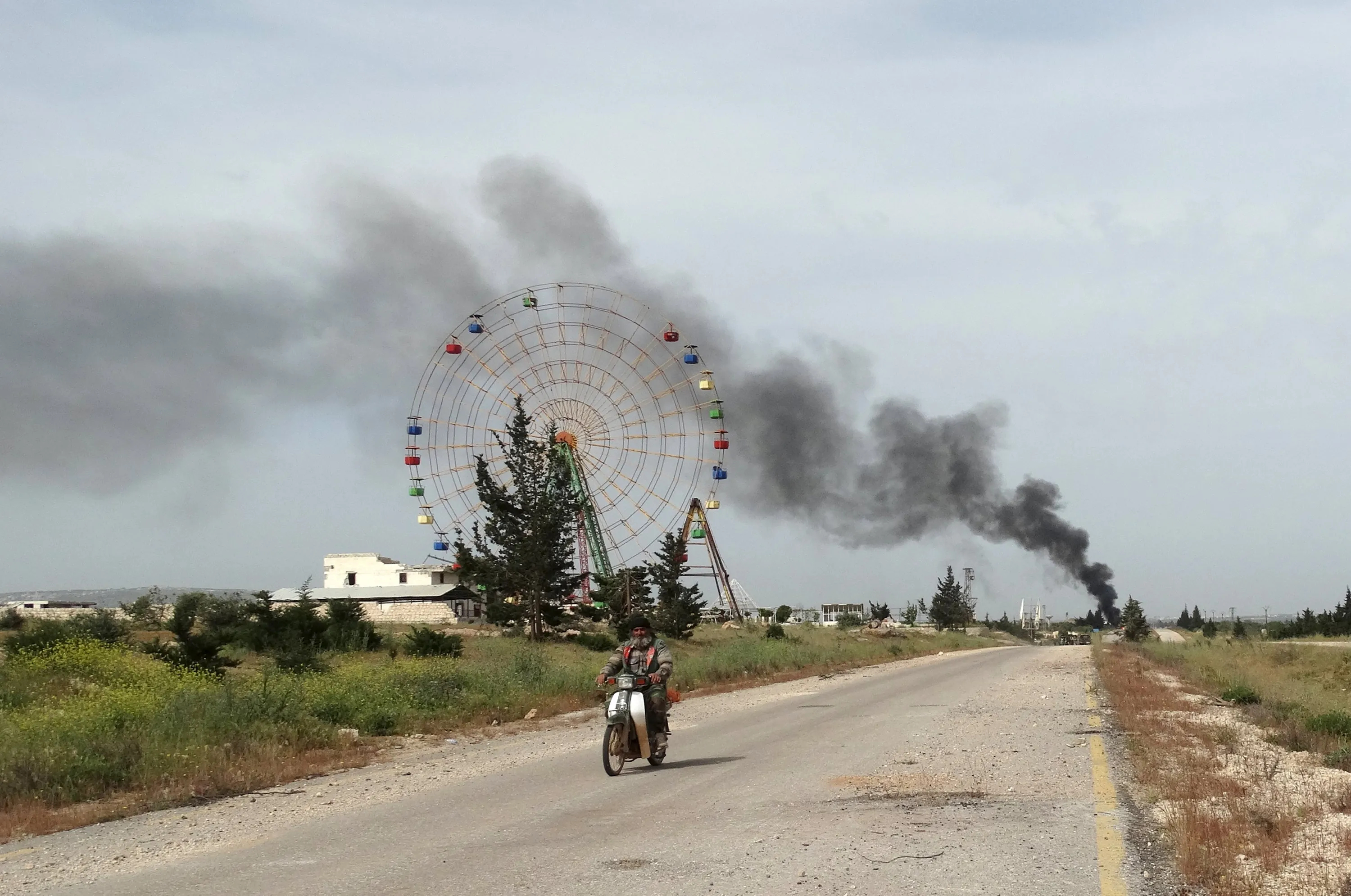 A rebel fighter rides a motorbike along a road in Qarmeed camp, as smoke rises in the background after Islamist rebel fighters took control of the area from forces of Syria's President Bashar al-Assad, April 27, 2015. (Photo by Abdalghne Karoof/Reuters)