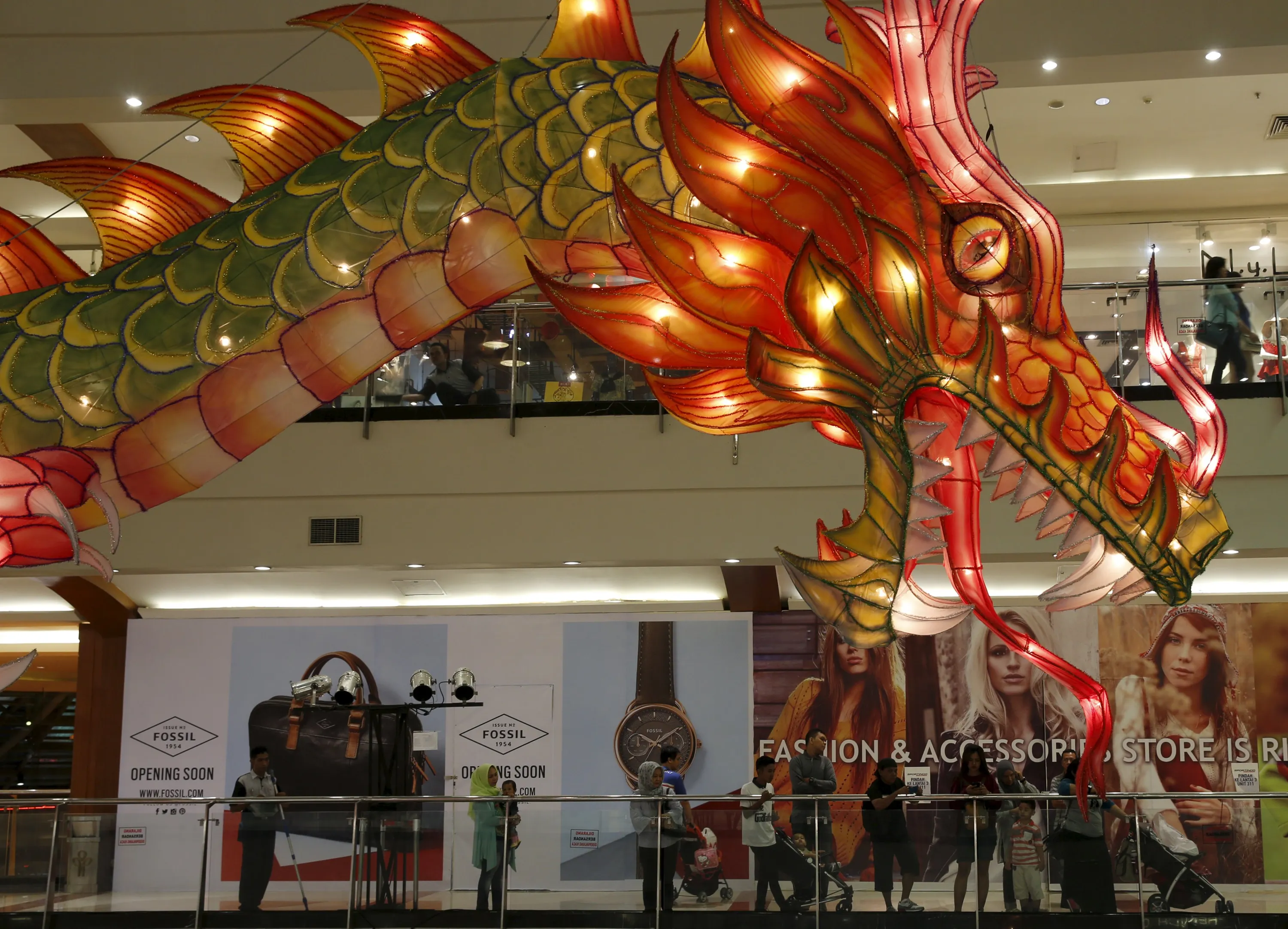 People stand near a dragon decoration for the upcoming Chinese Lunar New Year celebrations at Pondok Indah Mall in Jakarta, Indonesia February 6, 2016. (Photo by Reuters/Beawiharta)