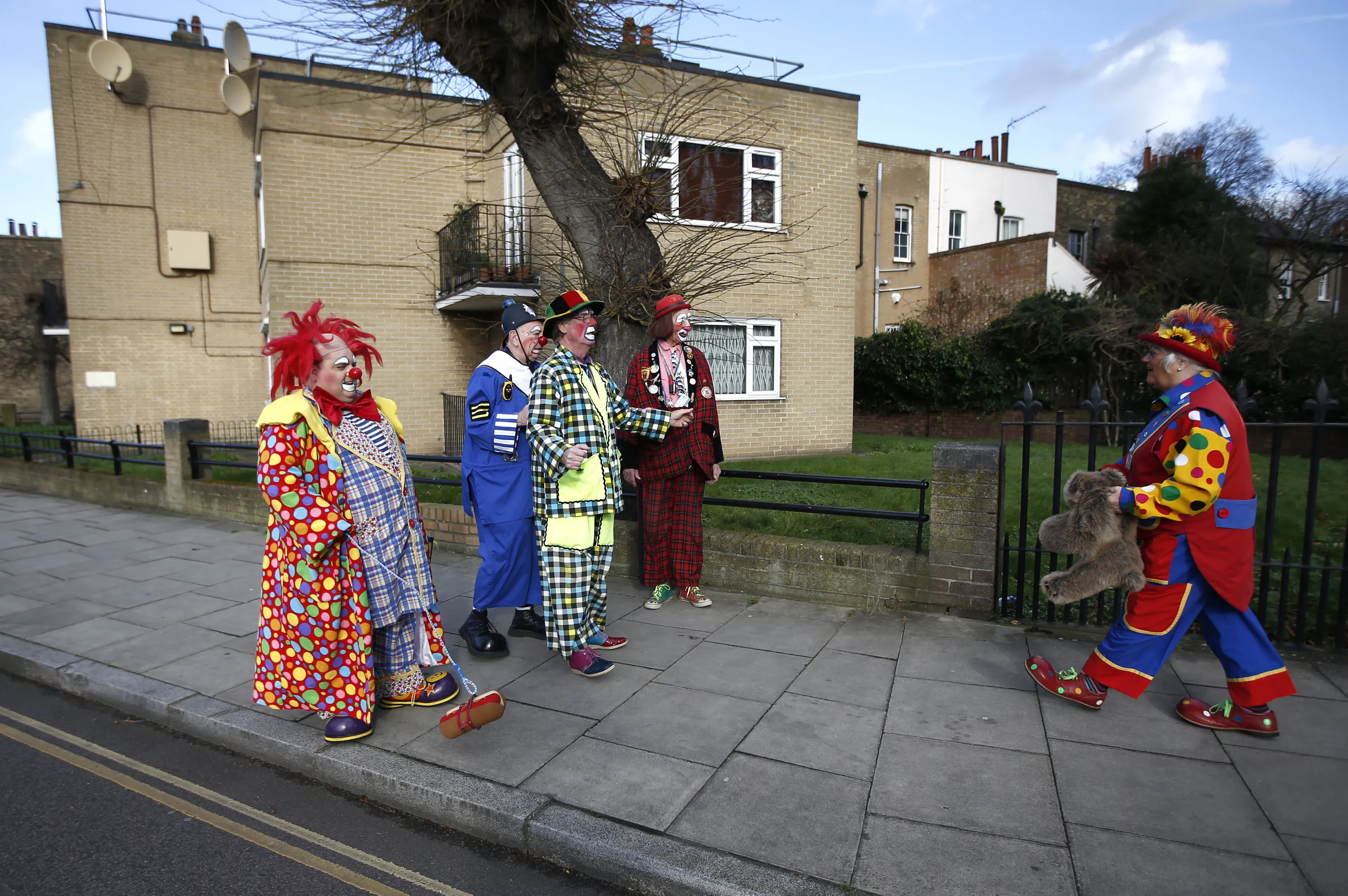 Clowns arrive at the All Saints Church before the Grimaldi clown service in Dalston, north London, February 7, 2016. (Photo by Peter Nicholls/Reuters)