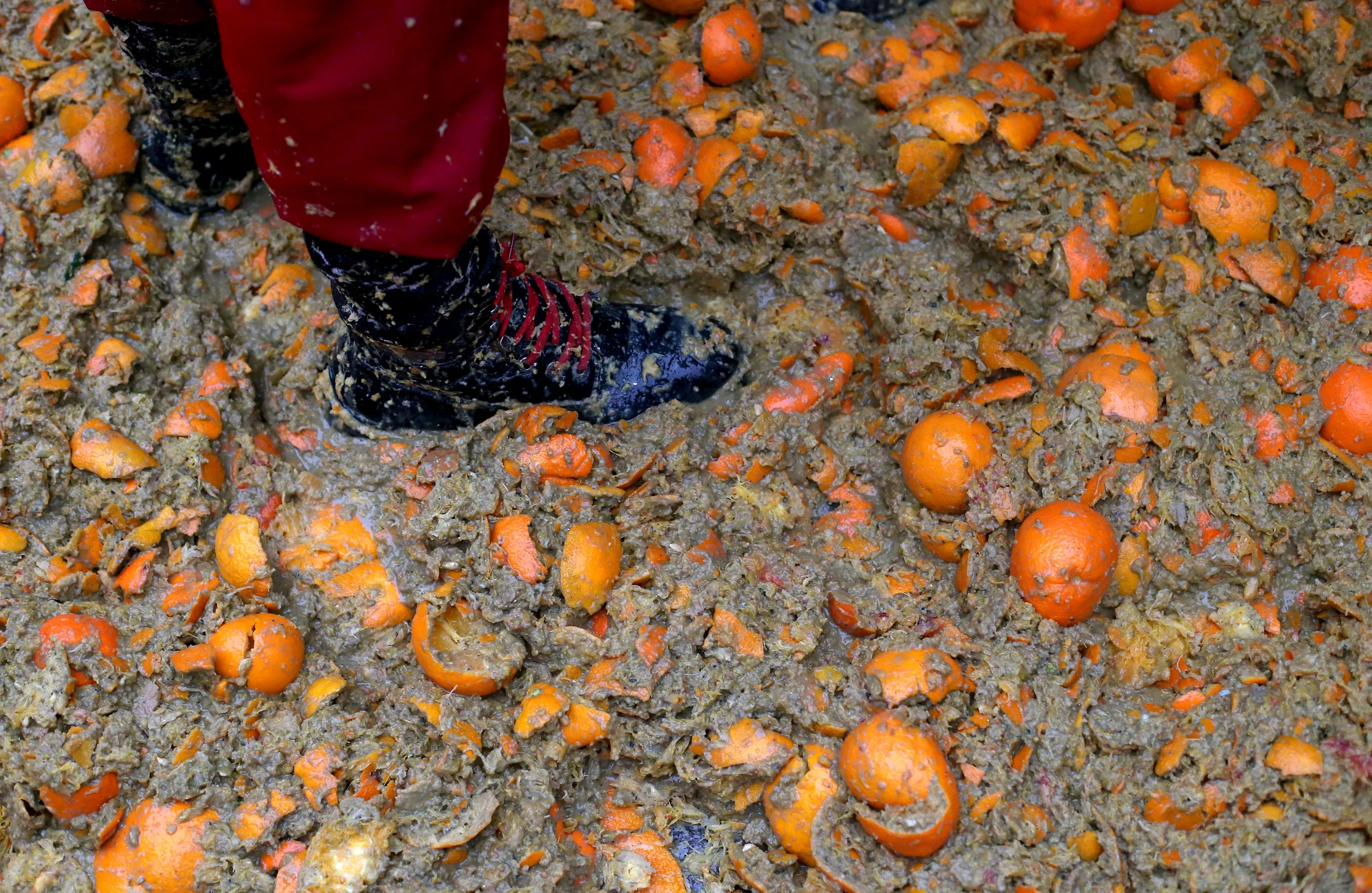 A member of a rival team stands in the middle of the square covered with oranges during an annual carnival battle in the northern Italian town of Ivrea February 7, 2016. (Photo by Stefano Rellandini/Reuters)