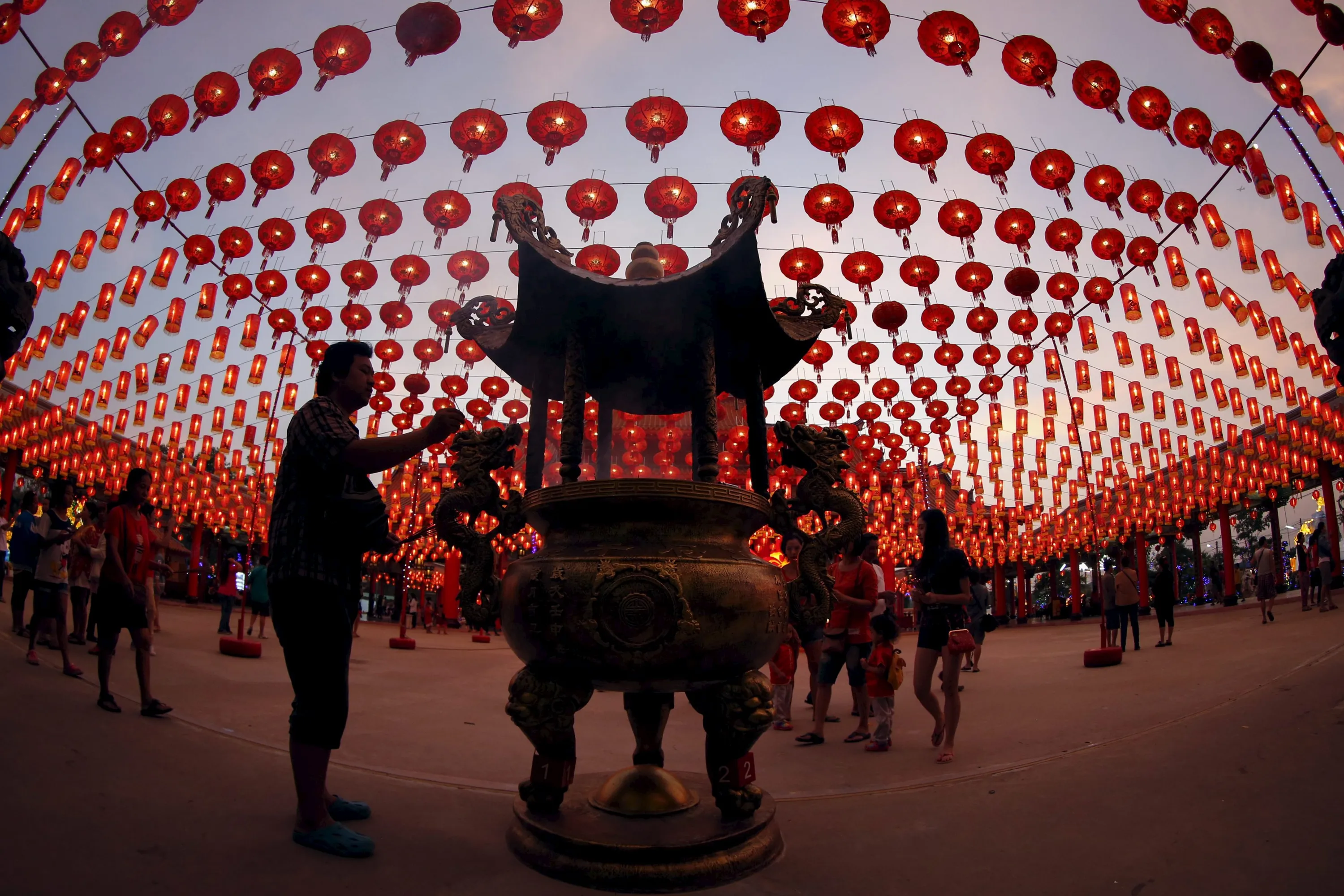 A man prays in a temple decorated to celebrate Chinese New Year at Samut Prakan province outside Bangkok February 7, 2016. (Photo by Jorge Silva/Reuters)