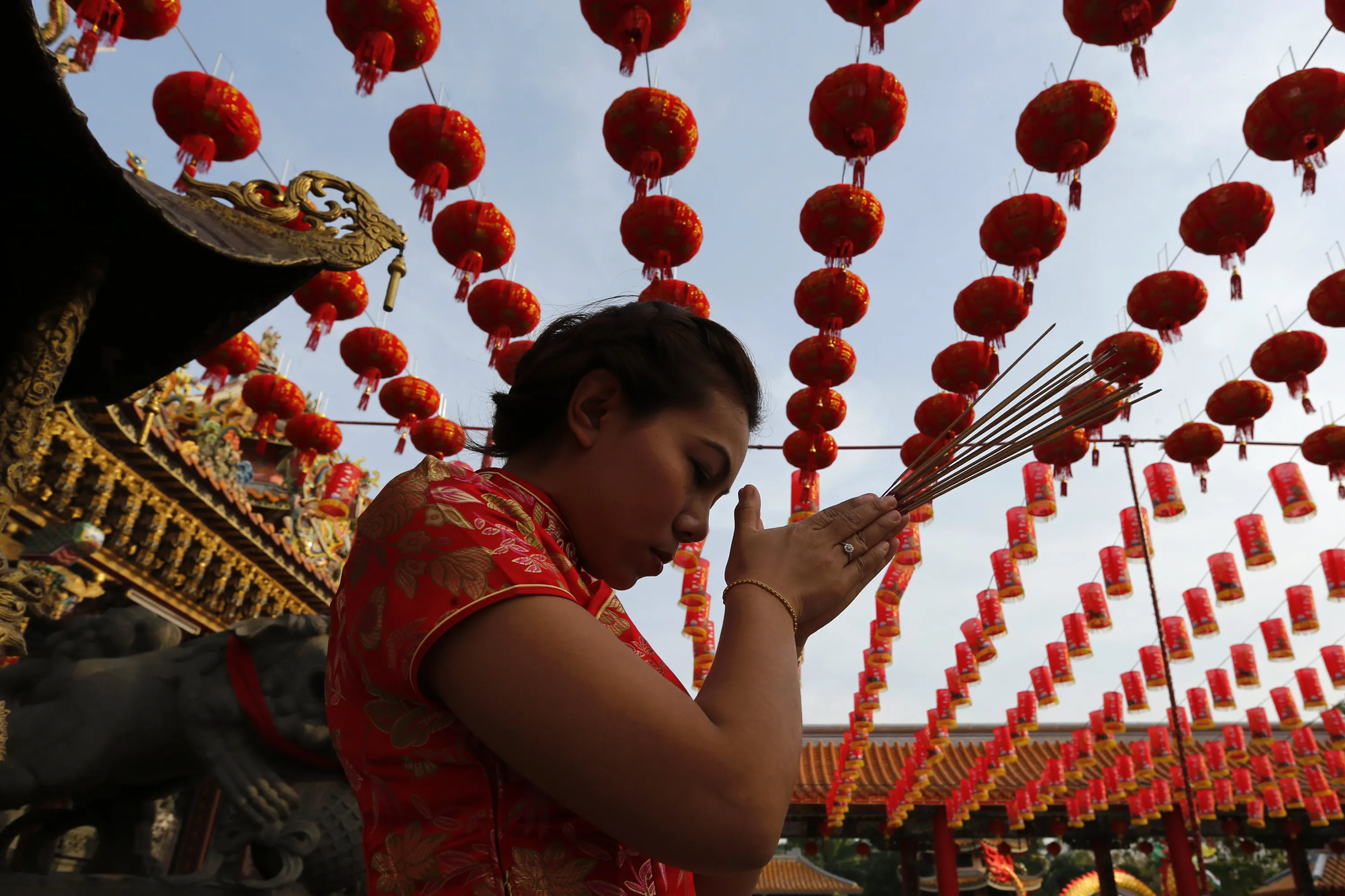 A woman prays in a temple decorated to celebrate Chinese New Year at Samut Prakan province outside Bangkok, Thailand February 7, 2016. (Photo by Jorge Silva/Reuters)