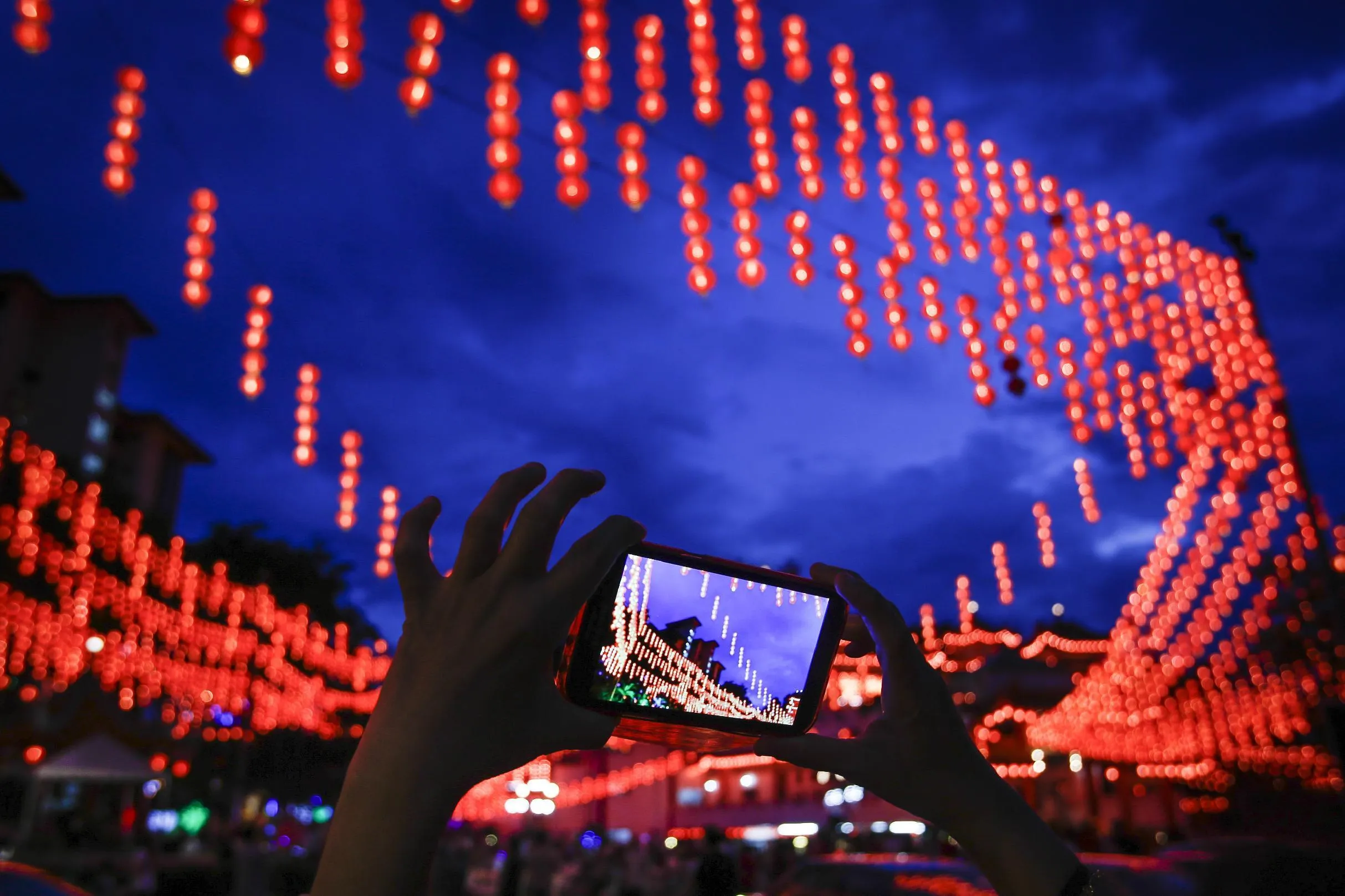 A Malaysian ethnic Chinese woman takes a souvenir photograph of illuminated traditional Chinese lanterns on the eve of Lunar New Year in Kuala Lumpur, Malaysia, Sunday, February 7, 2016. (Photo by Joshua Paul/AP Photo)