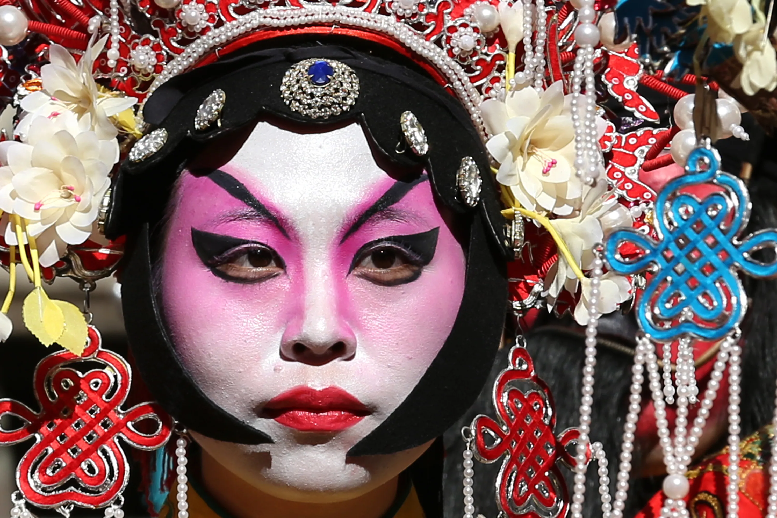 A woman dressed in traditional Chinese costumes waits to perform in celebration of the Chinese New Year on a stage at the Nankinmachi square, China Town on February 8, 2016 in Kobe, Japan. In Nankinmachi, the district known as Kobe Chinatown, tourists enjoyed Chinese food, lion dance and the parade organized to celebrate the Lunar New Year. (Photo by Buddhika Weerasinghe/Getty Images)