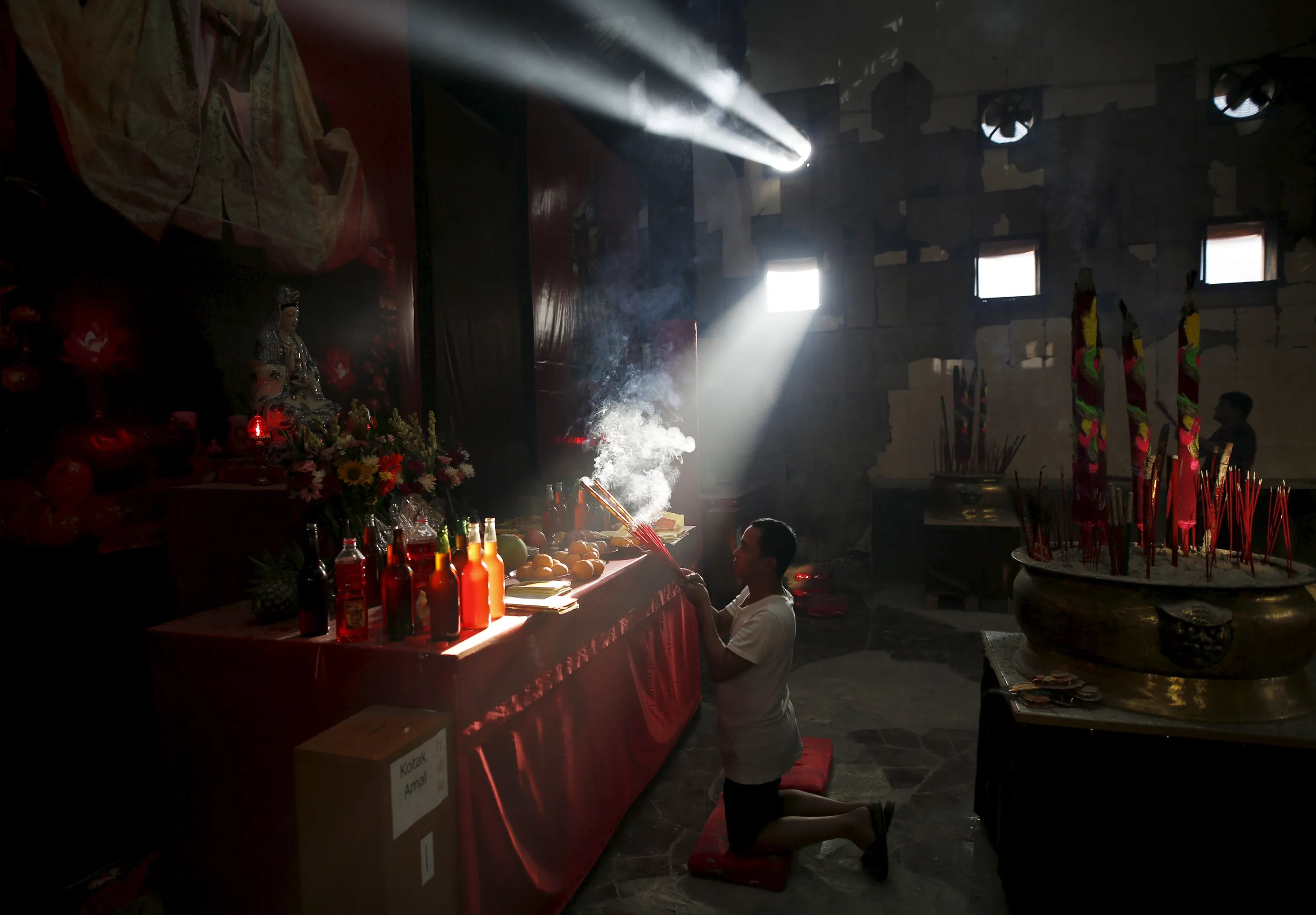 A man prays with joss sticks at Dharma Bhakti Temple on the first day of the Lunar New Year in Jakarta, Indonesia February 8, 2016. (Photo by Darren Whiteside/Reuters)