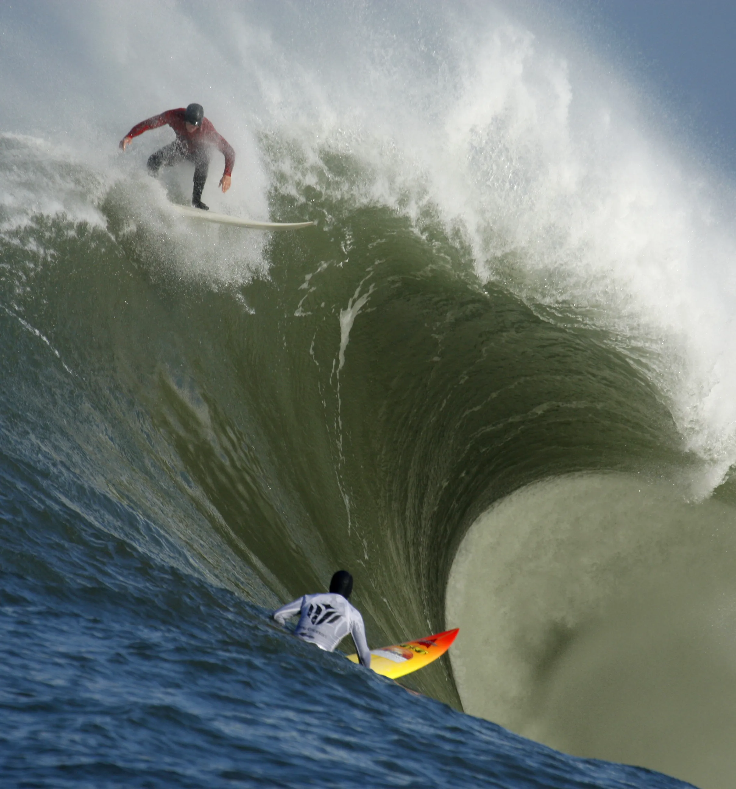 In this February 13, 2010, file photo, Evan Slater, top, surfs a giant wave over Darryl “Flea” Virostko during the first heat of the Mavericks surf contest in Half Moon Bay, Calif. The world's best big-wave competition, Titans of Mavericks has been set for Friday, February 12, 2016. Mavericks is the world's premiere, high adrenaline, big wave surfing event is a one-day invitation-only surfing competition that is held at the legendary Mavericks surf break located near Half Moon Bay, about 20 miles south of San Francisco. (Photo by Ben Margot/AP Photo)