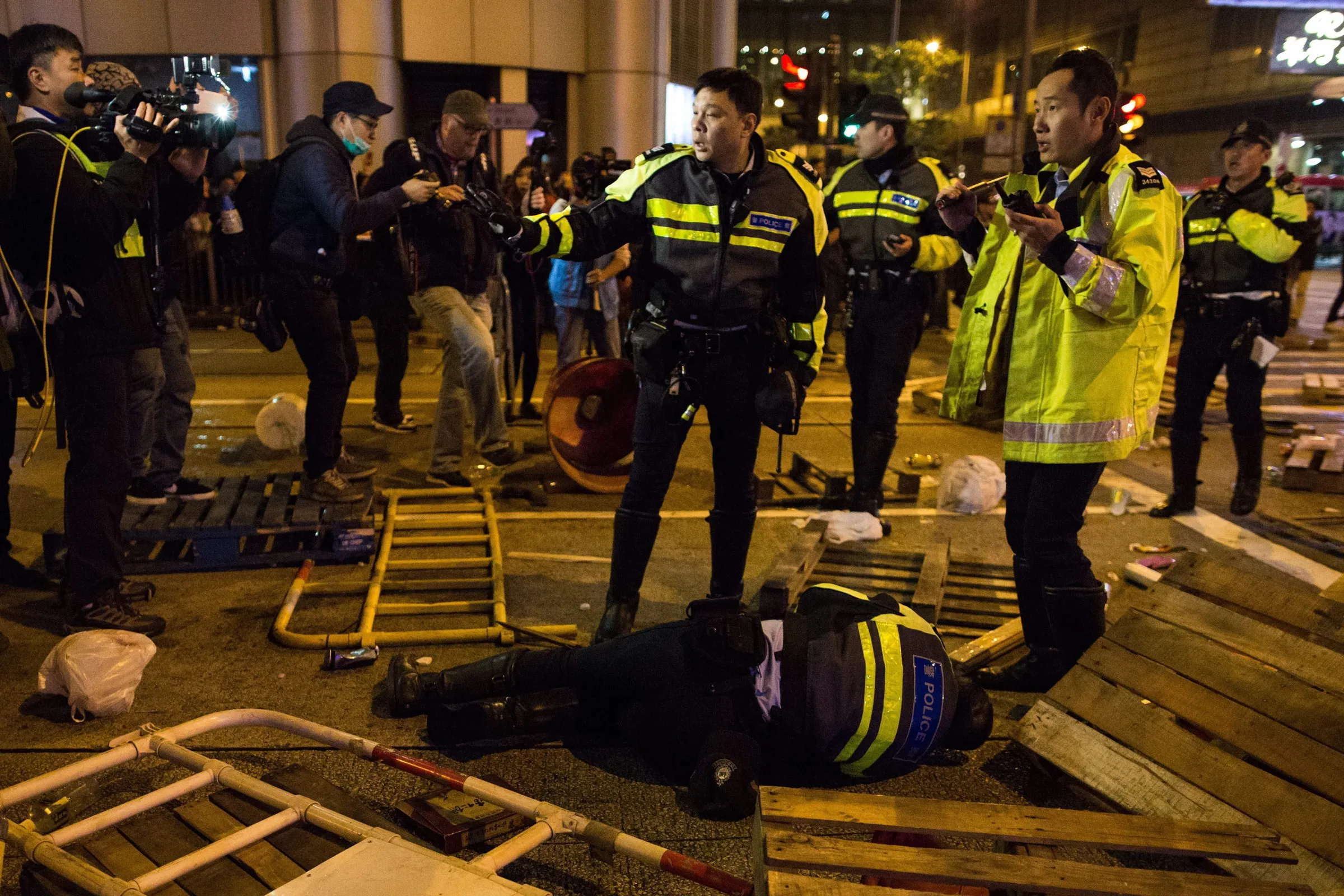 Police officers attend to a colleague laying on the ground during riots in Mongkok district in Hong Kong, China, 09 February 2016. Food vendors selling fish balls and other Lunar New Year holiday delicacies at illegal food stalls clashed with police trying to clear the area in the Mong Kok area of Hong Kong early 09 February. Police had to fire 'warning shots' after angry protesters attacked them with "self-made weapons" and threw glass bottles, bricks and rubbish bins at them, injuring some 44 police officers, media reported. The unrest began late at night when police tried to clear the area of hawkers as part of a city-wide clampdown on illegal food stalls. More than 100 angry food hawkers resisted and attacked police and food and hygiene officials as tempers flared. Police resorted to using pepper spray and batons to try and keep the “riot” under control. (Photo by Anthony Kwan/EPA)