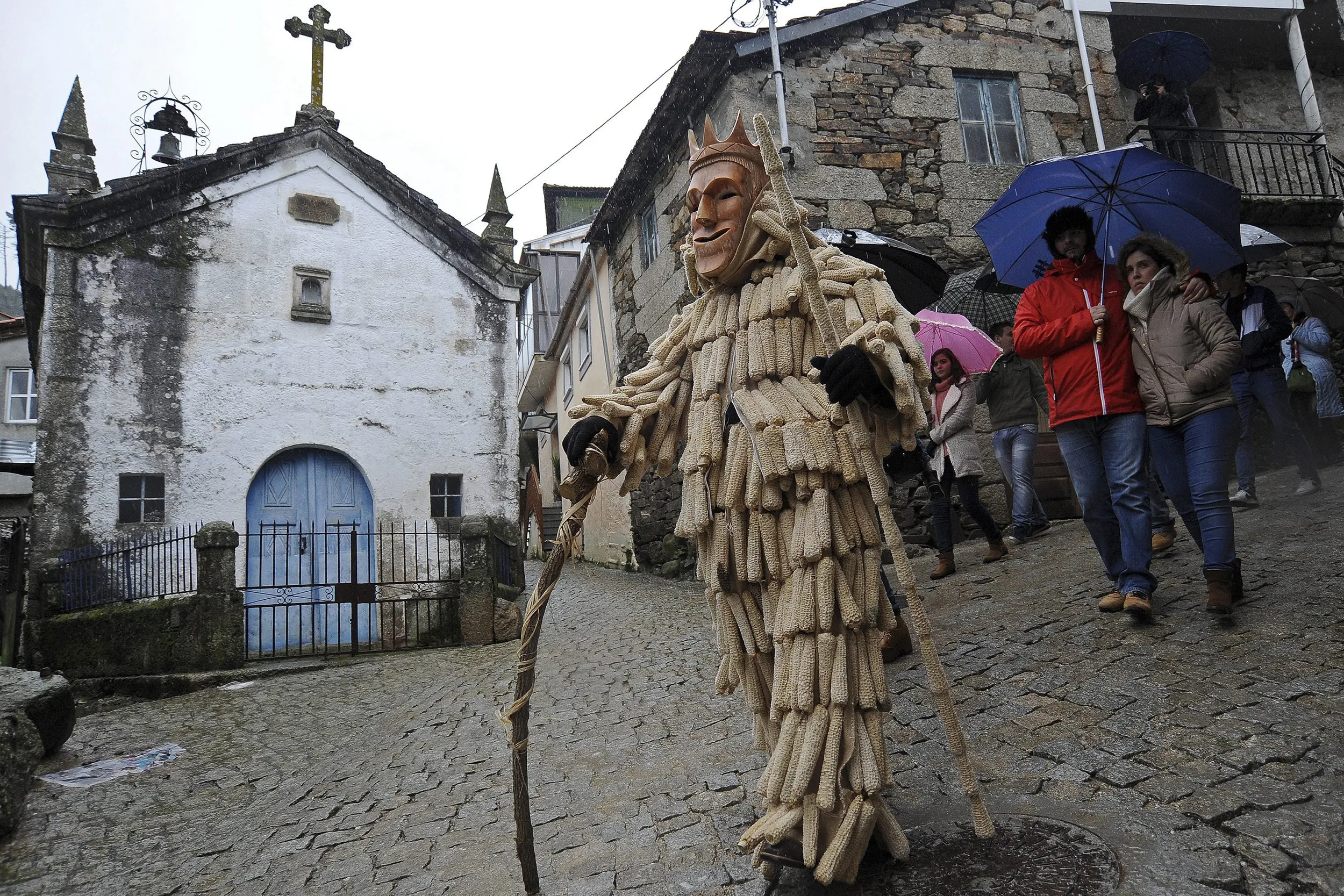 A man dressed as a traditional “careto” during the Lazarim carnival in Lamego, Portugal, 09 January 2016. “Caretos” are a traditional celebration of the Portuguese carnival dating back to Celtic times where young men dress colorfull clothes, wooden masks and rattle belts to scare people on the streets specially single young girls. (Photo by Octavio Passos/EPA)