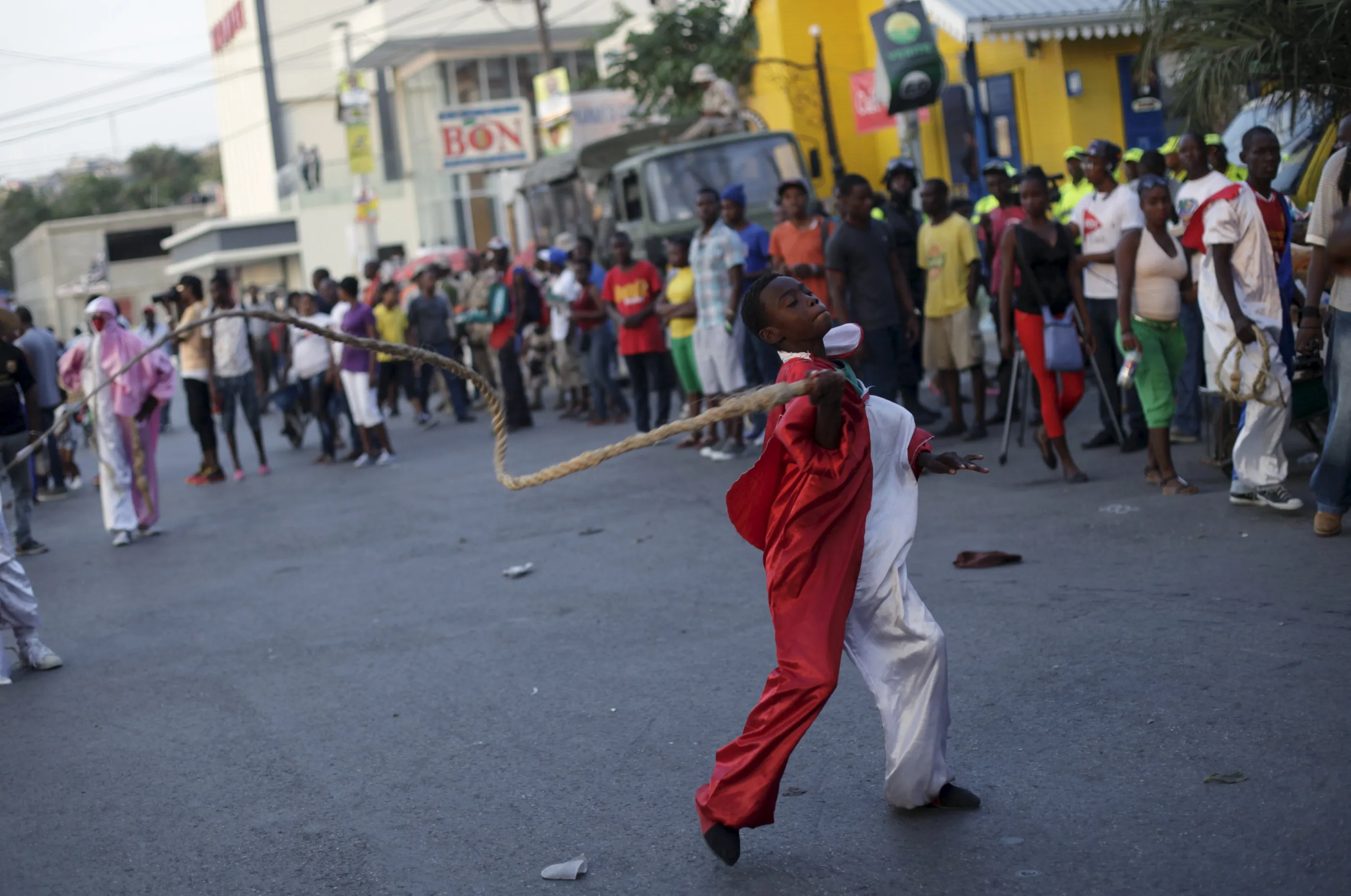 A reveller uses a whip as he takes part in the Carnival 2016 parade in Port-au-Prince, Haiti, February 9, 2016. (Photo by Andres Martinez Casares/Reuters)