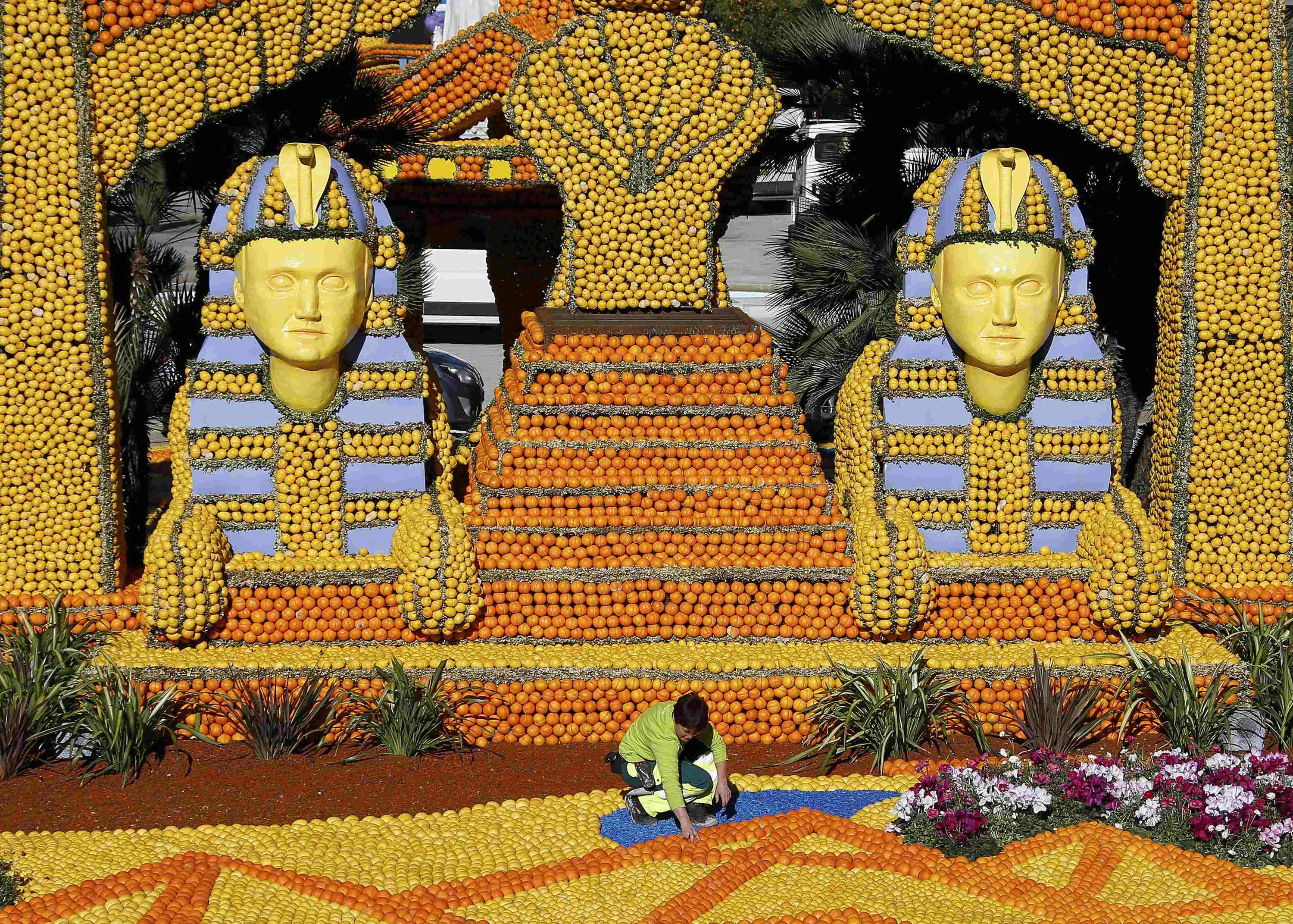 A worker puts the final touch to a replica of a giant pharaons made with lemons and oranges which shows a scene of the movie “Cleopatra” during the Lemon festival in Menton, France, February 10, 2016. (Photo by Eric Gaillard/Reuters)