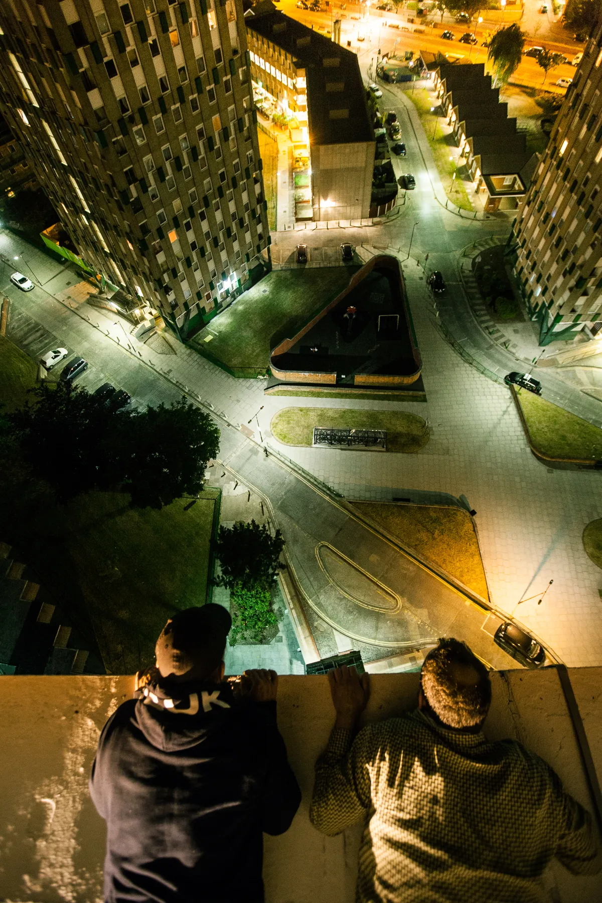 Cranbrook Estate, Bethnal Green. Two explorers check to see if the police are responding to their “popping” the roof hatch. (Photo by Thomas Dekeyser)