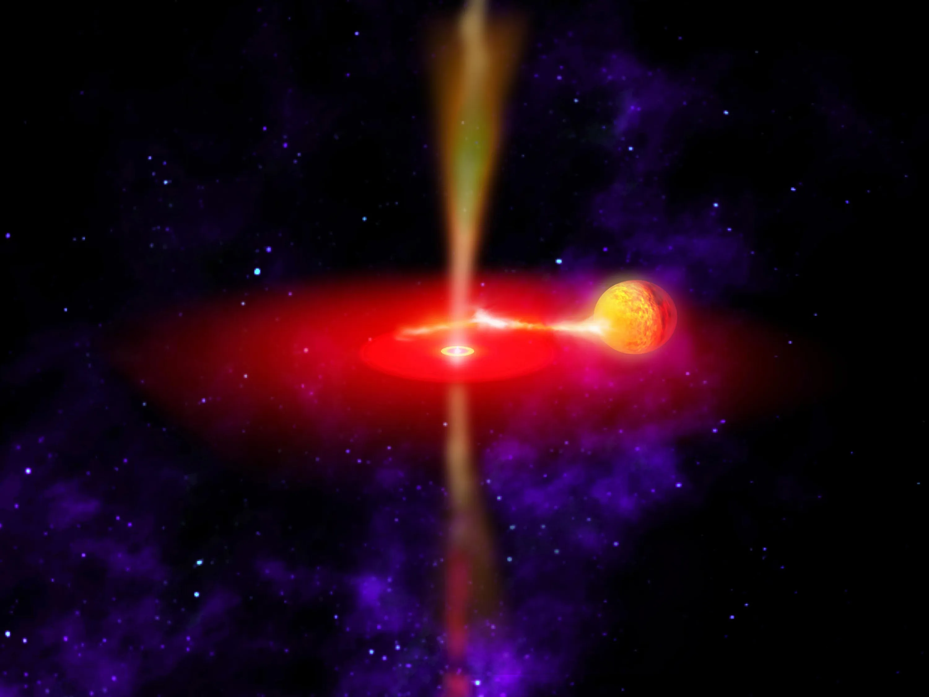 An artist's concept illustrates what the flaring black hole called GX 339-4 might look like in this NASA handout image. Infrared observations from NASA's Wide-field Infrared Survey Explorer (WISE) reveal the best information yet on the chaotic and extreme environments of this black hole's jets. GX 339-4 likely formed from a star that exploded. It is surrounded by an accretion disk (red) of material being pulled onto the black hole from a neighboring star (yellow orb). Some of this material is shot away in the form of jets (yellow flows above and below the disk). The region close in to the black hole glows brightly in infrared light. (Photo by Reuters/NASA/JPL)