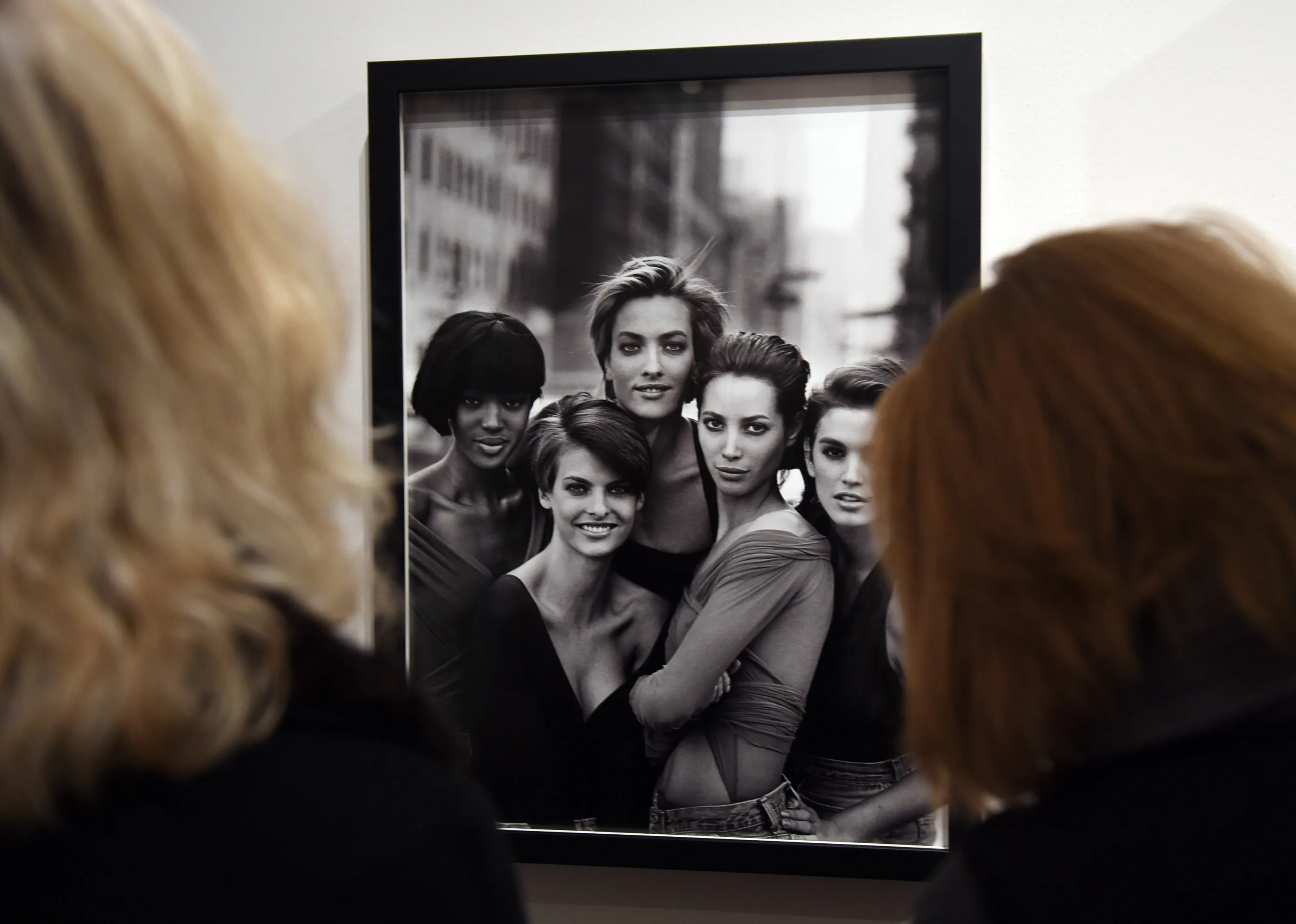 Journalists look at a photo of famous models at the press preview for “Vogue 100: A Century of Style” exhibiting the photographs that has been commissioned by British Vogue since it was founded in 1916 at National Portrait Gallery on February 10, 2016 in London, England. (Photo by Stuart C. Wilson/Getty Images)