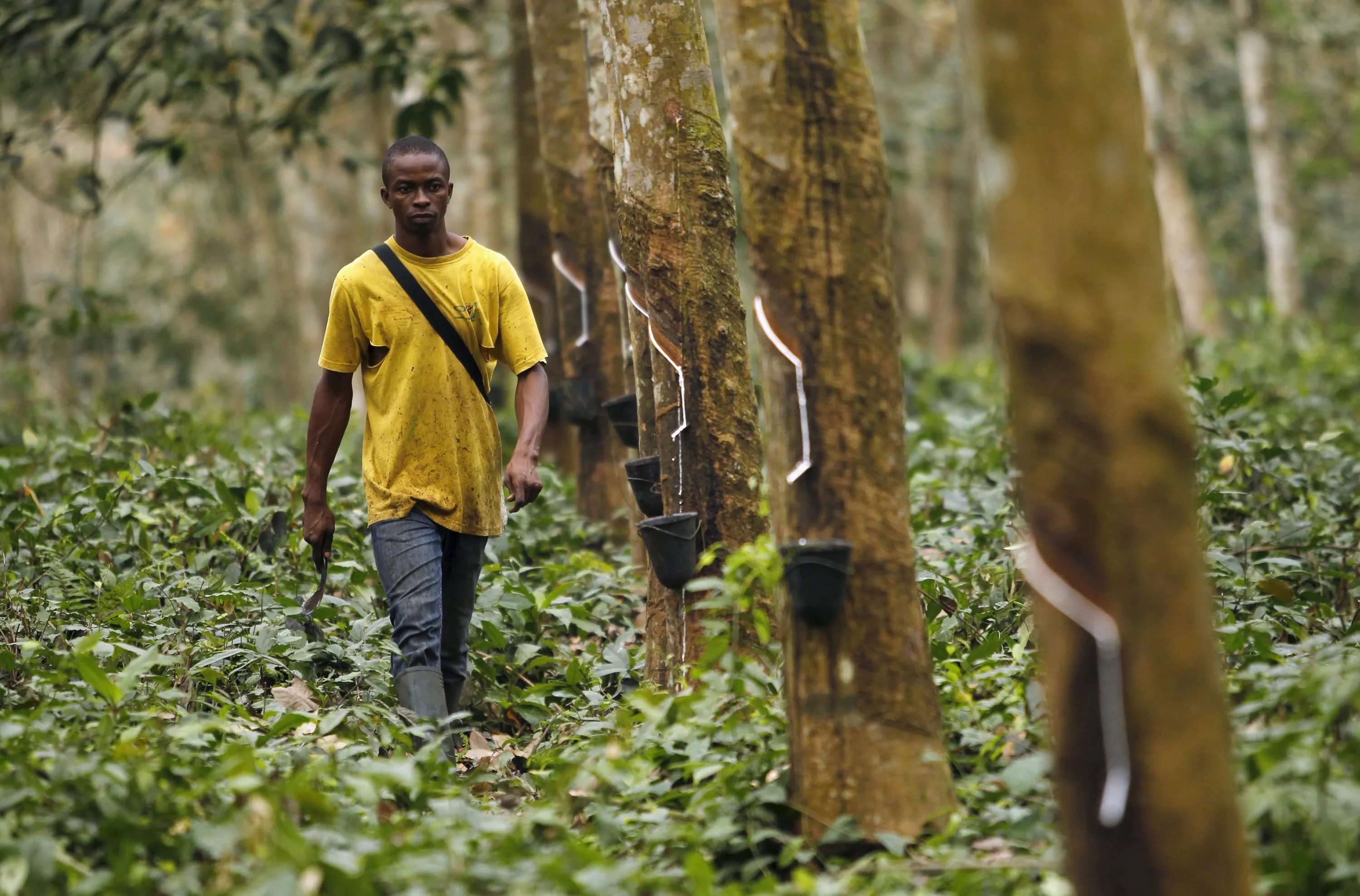A worker walks down a row of rubber trees as he prepares to collects rubber sap at a farm in Songon village, north of Abidjan February 3, 2016. (Photo by Luc Gnago/Reuters)