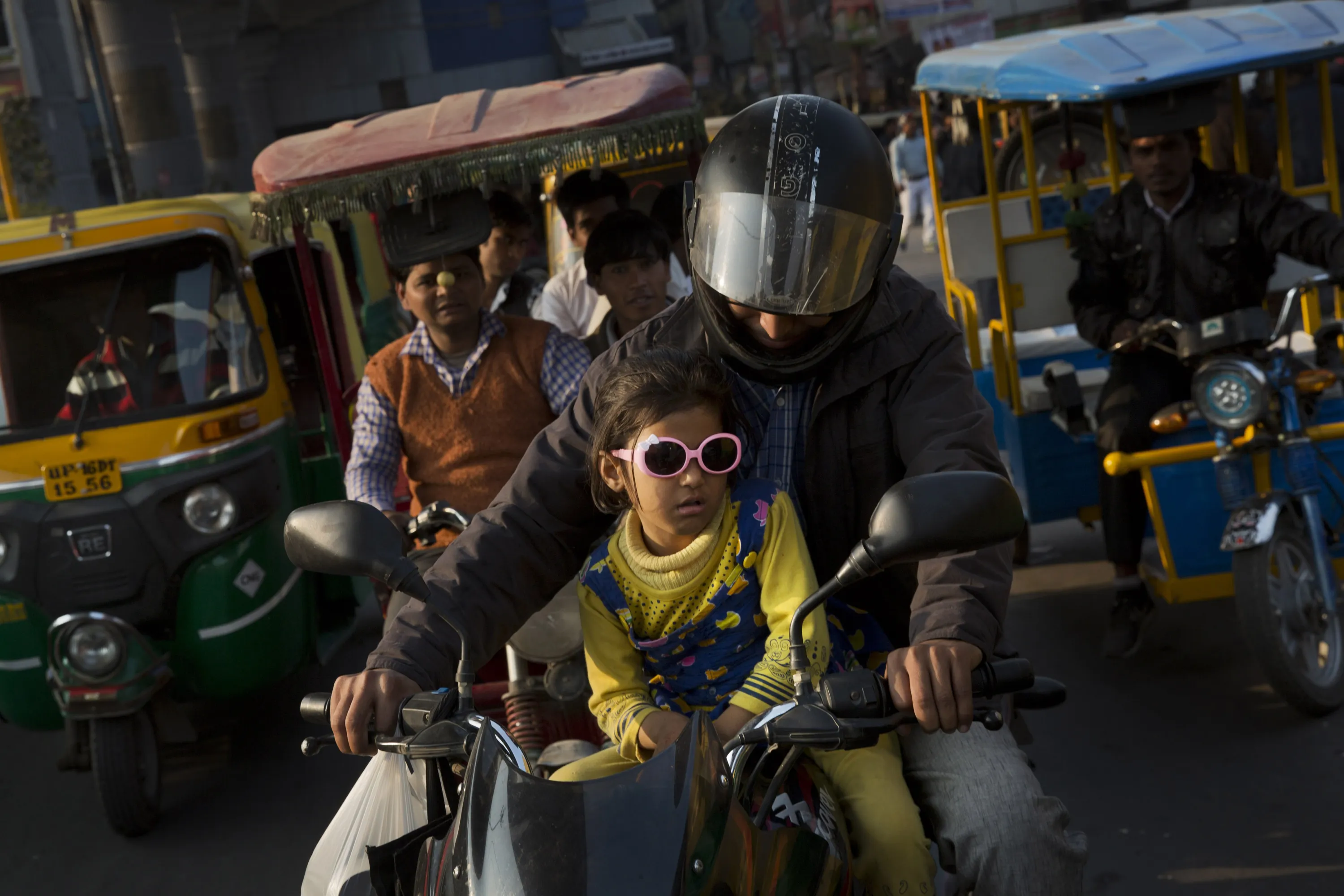 Motorbike and auto-rickshaw drivers make their way through a busy street in Noida, near New Delhi, India, Tuesday, February 9, 2016. (Photo by Bernat Armangue/AP Photo)