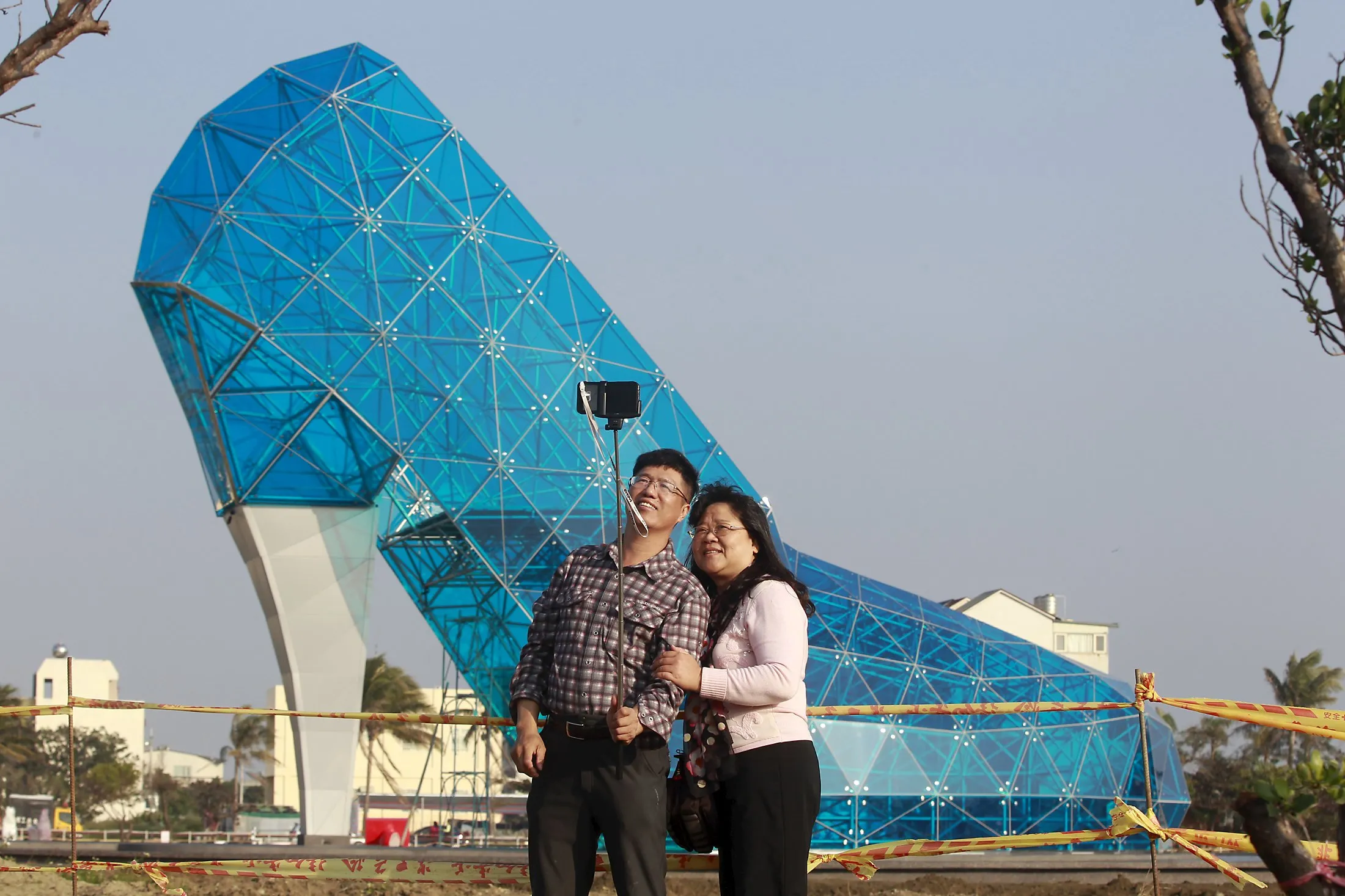 People take selfies in front of a shoe-shaped church in Chiayi, southern Taiwan, January 18, 2016. The church, which is about 17 meter (55 feet) tall and 11 meter (36 feet) wide, took three months and about $685,000 to build. It is expected to open in February 2016, before the Lunar New Year, according to the Chiayi county government official. (Photo by Pichi Chuang/Reuters)