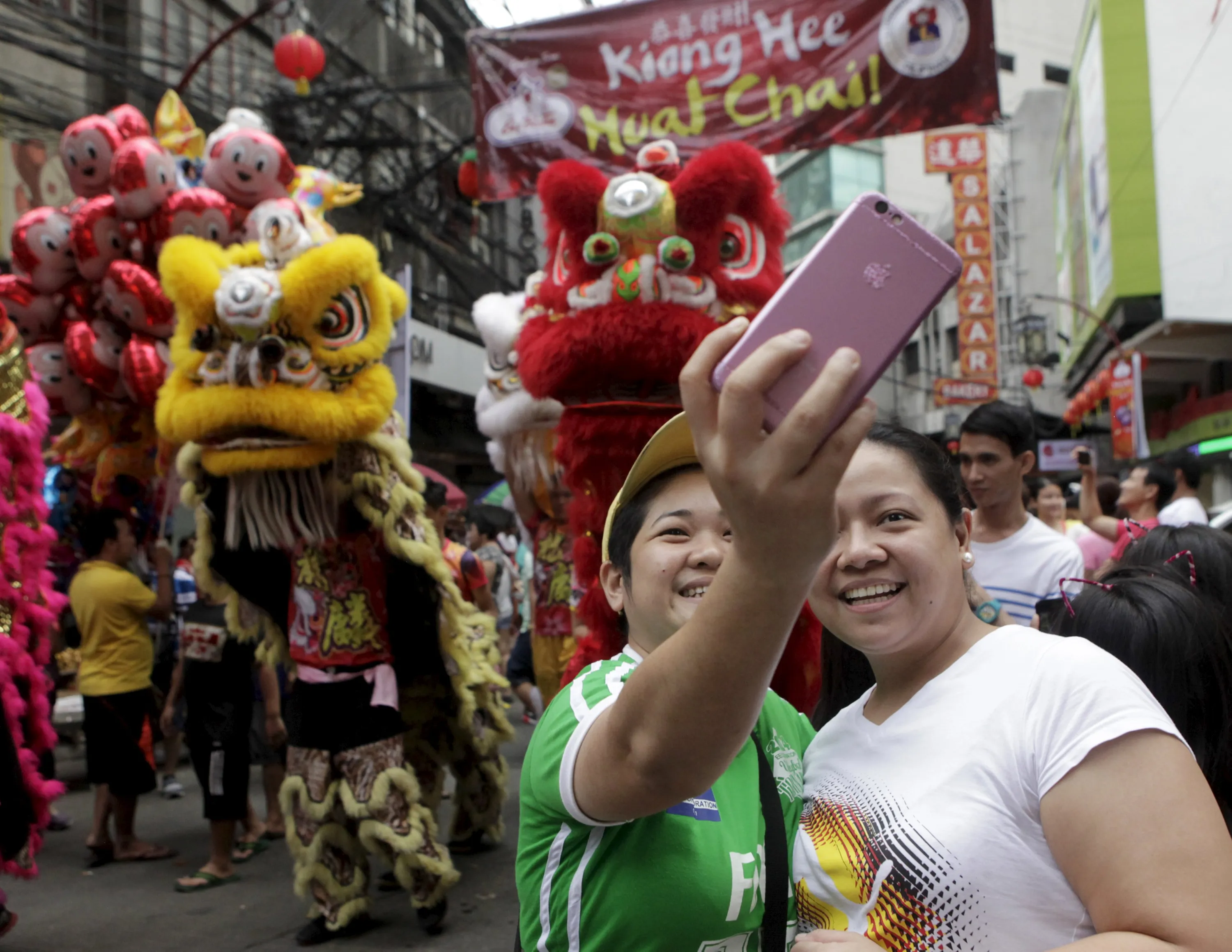 Residents take a selfie near lion dancers on the eve of the Chinese Lunar New Year in Manila's Chinatown, Philippines February 7, 2016. (Photo by Janis Alano/Reuters)