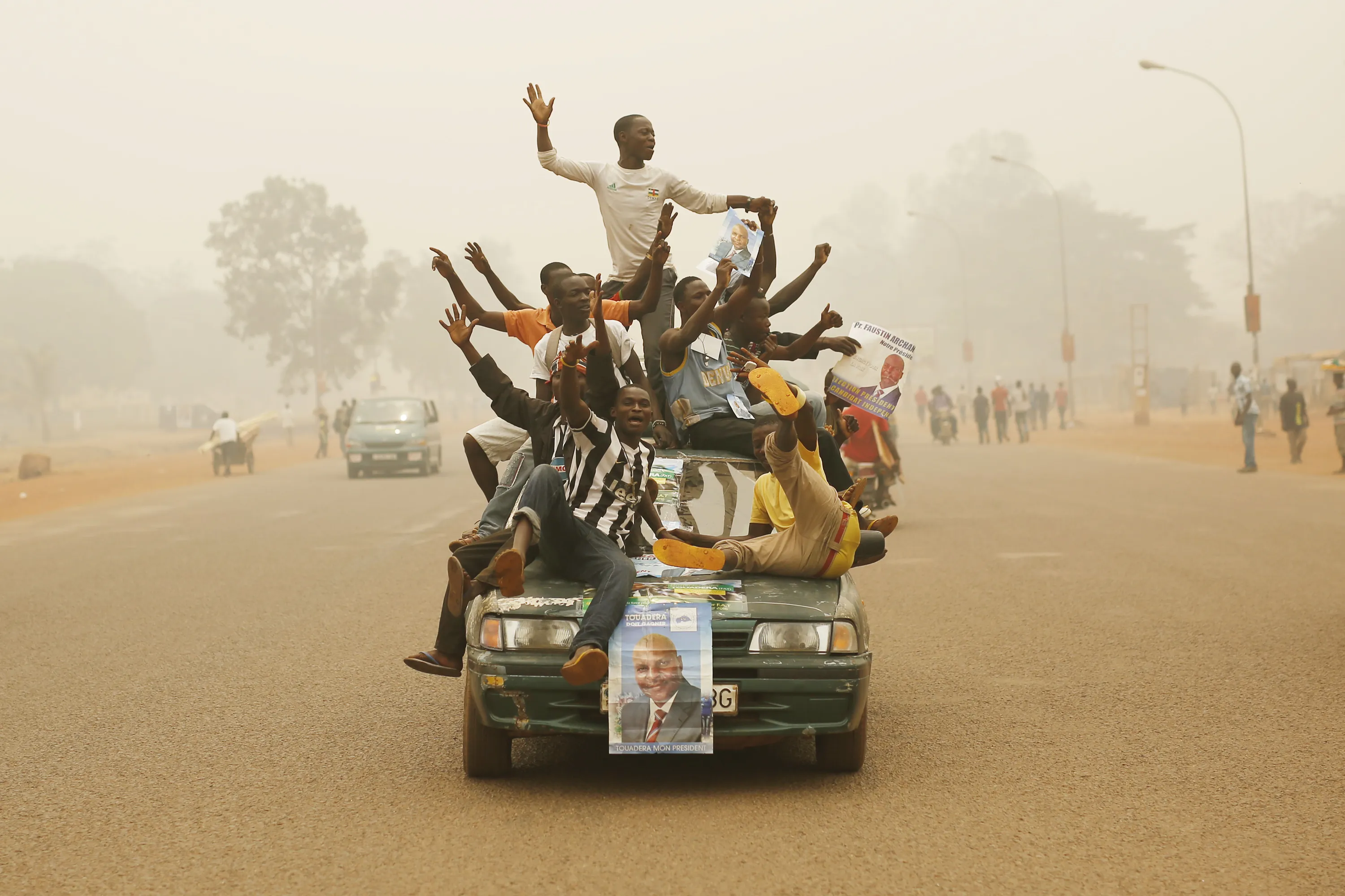 Supporters of Presidential candidate Faustin Archange Touadera rally during a sand storm in the streets of Bangui, Central African Republic, February 12, 2016. Two former prime ministers, Touadera and Anicet Georges Dologuele, are running neck-and-neck in the second round of presidential elections Sunday Feb. 14 to end years of violence pitting Muslims against Christians in the Central African Republic. (Photo by Jerome Delay)/AP Photo