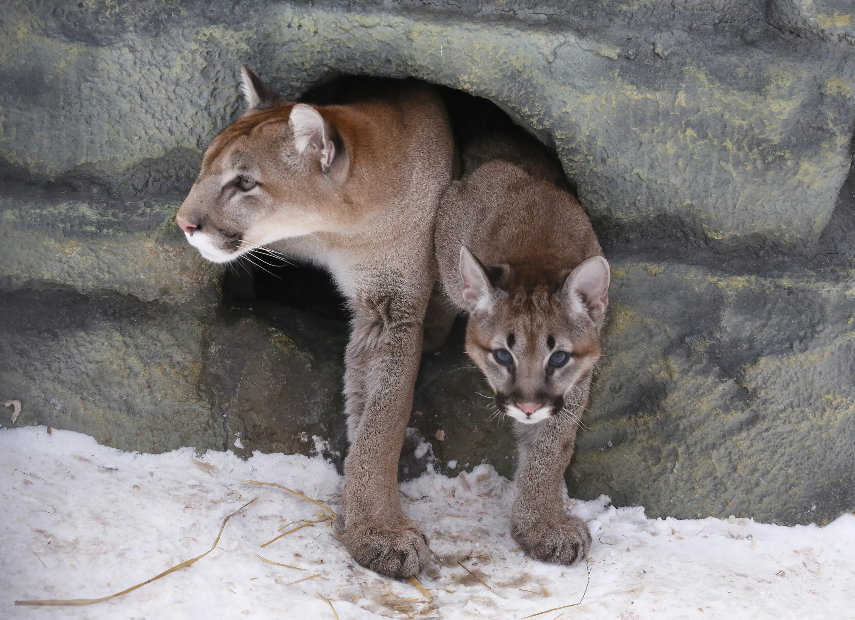 Ice (L), a three-year-old female North American cougar, and its four-month-old cub leave their den in the Royev Ruchey zoo on the suburbs of the Siberian city of Krasnoyarsk, Russia, February 11, 2016. Ice and another cougar Arnaldo, who were both born at the zoo, gave birth to two cubs, according to employees. (Photo by Ilya Naymushin/Reuters)