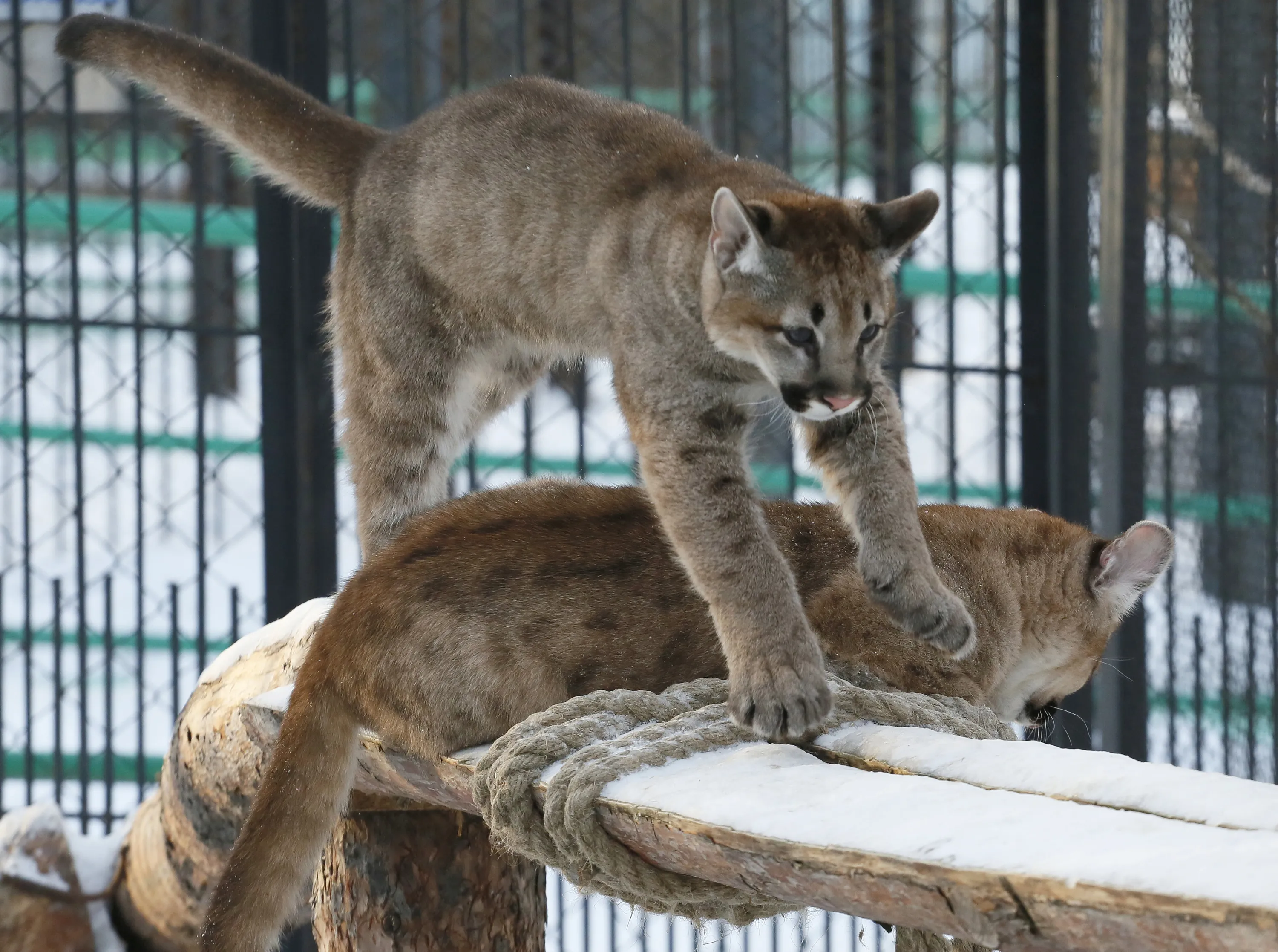 Two four-month-old North American cougars play in the Royev Ruchey zoo on the suburbs of the Siberian city of Krasnoyarsk, Russia, February 11, 2016. (Photo by Ilya Naymushin/Reuters)