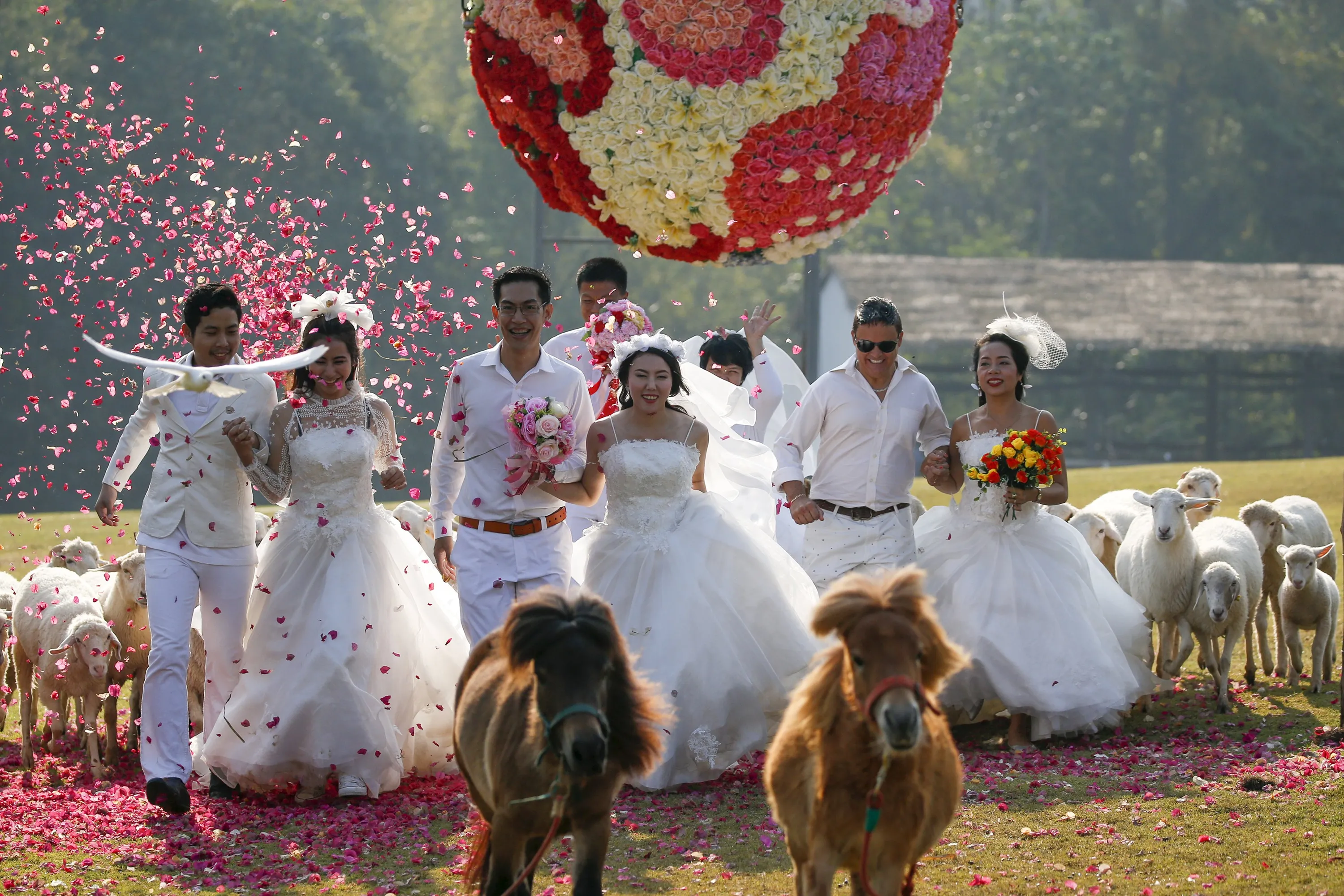 (From L-R) Kittinant Suwansiri and Jintara Promchat, Kasemsak Jiranantiporn and Duangruethai Amnuayweroj, and David Leslie Chesterman and Charunee Koydun run among animals during a wedding ceremony ahead of Valentine's Day at a resort in Ratchaburi province, Thailand, February 13, 2016. (Photo by Athit Perawongmetha/Reuters)