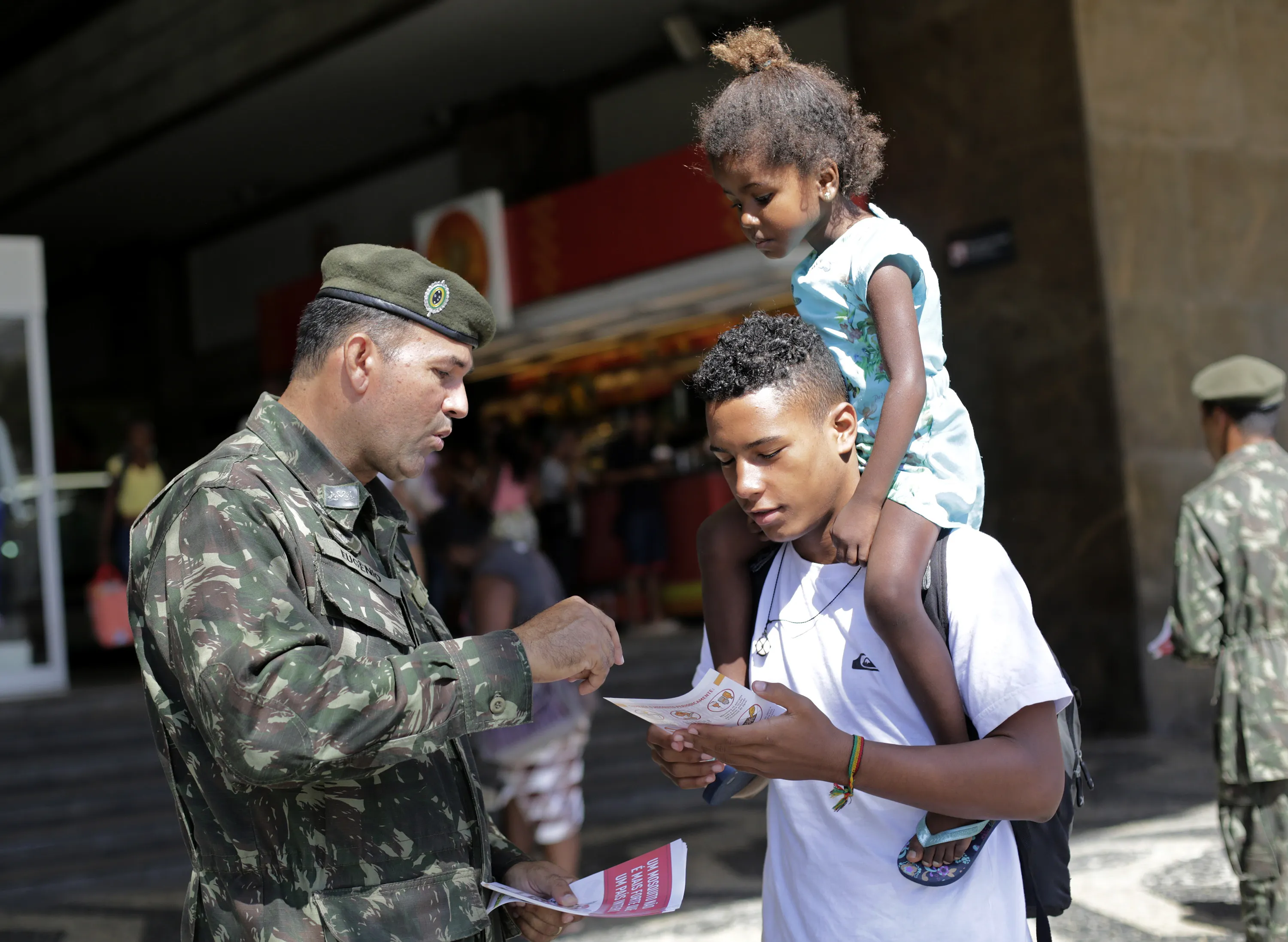 An army soldier explain how to combat the Aedes aegypti mosquito that spreads the Zika virus, at the Central station, in Rio de Janeiro, Brazil, Saturday, February 13, 2016. More than 200,000 army, navy and air force troops are fanning out across Brazil to show people how to eliminate the Aedes aegypti mosquito that spreads the Zika virus, which many health officials believe is linked to severe birth defects. The nationwide offensive is part of President Dilma Rousseff's declared war on the virus that has quickly spread across the Americas. (Photo by Silvia Izquierdo/AP Photo)