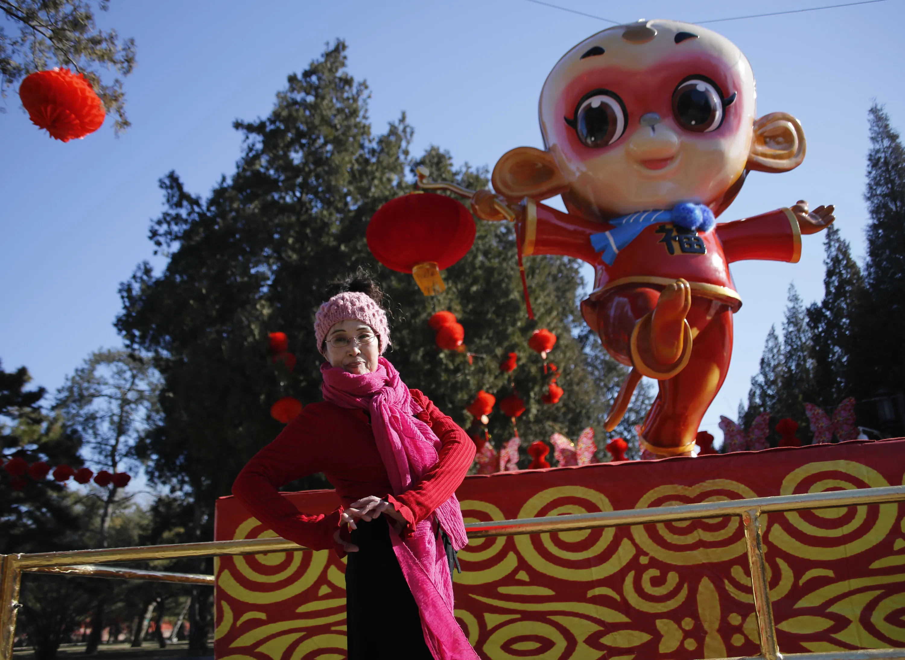 A woman poses in front of a monkey-shaped installation set up for celebrating the upcoming Chinese Lunar New Year of the Monkey ahead of the temple fair in Ditan Park, also known as the Temple of Earth, in Beijing, China, February 5, 2016. (Photo by Kim Kyung-Hoon/Reuters)