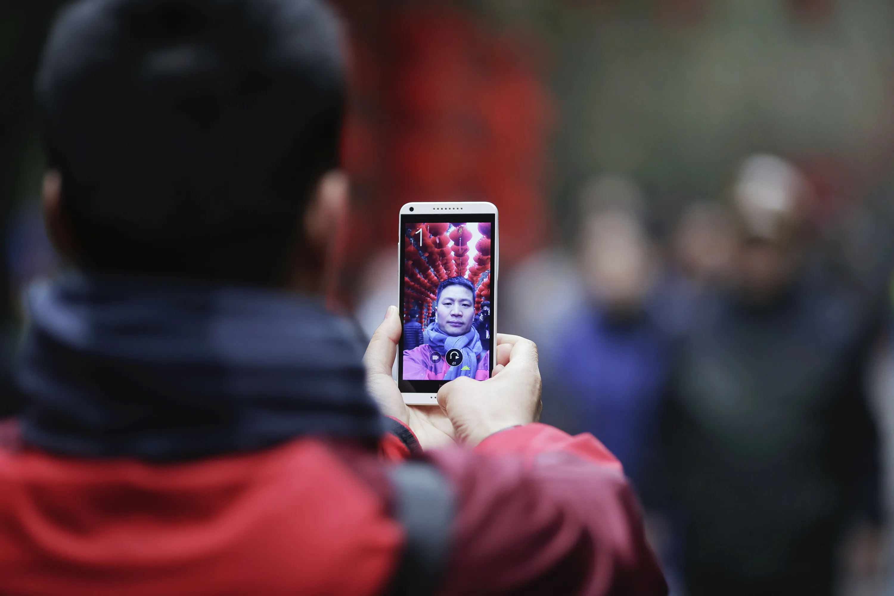 A man takes a picture of himself under red lanterns as the Chinese Lunar New Year, which welcomes the Year of the Monkey, is celebrated at the temple fair at Ditan Park (the Temple of Earth), in Beijing, China February 11, 2016. (Photo by Damir Sagolj/Reuters)