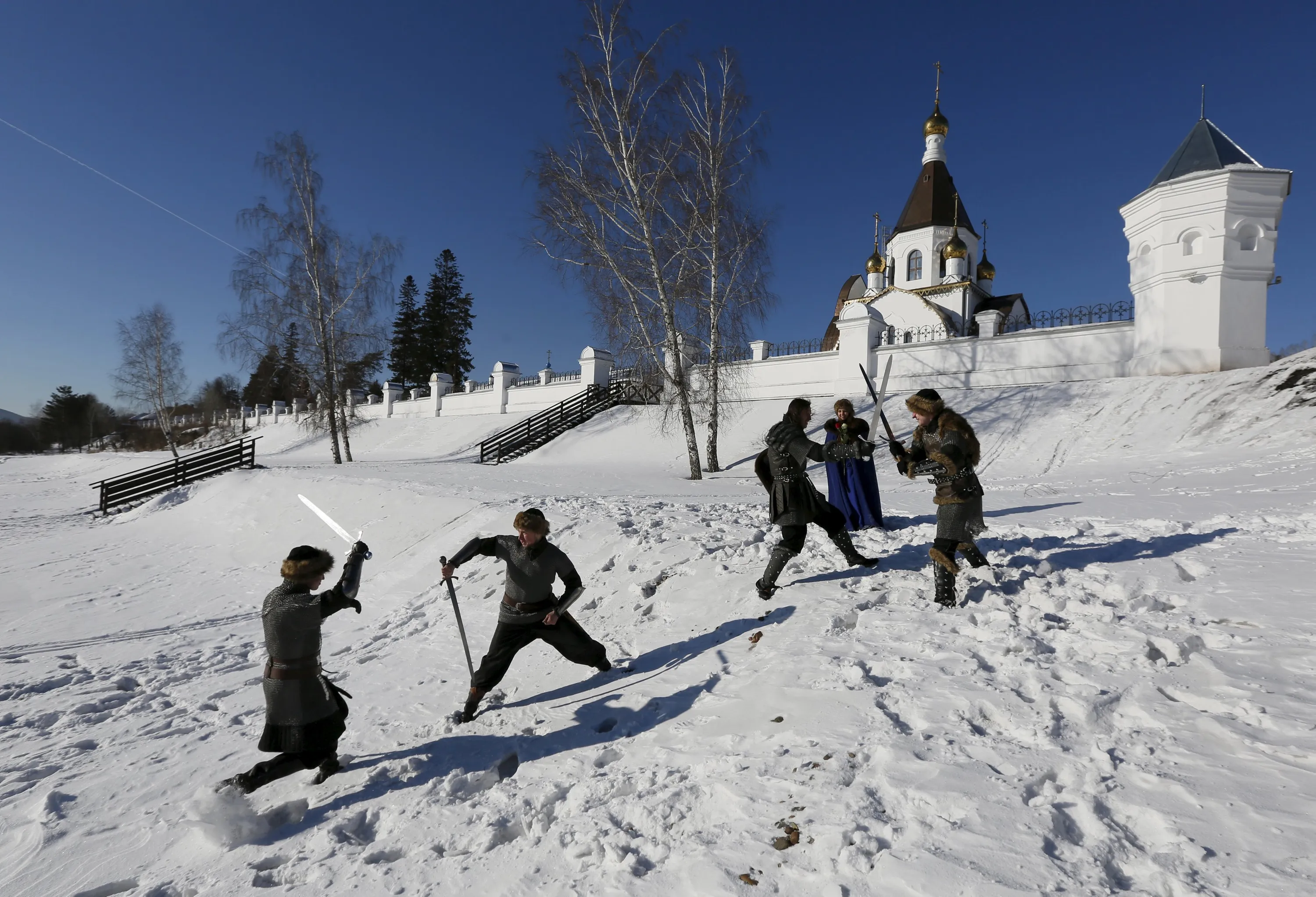 Members of the “Grifon” (Griffin) amateur club of artistic fencing, dressed as medieval East European soldiers and a woman, participate in a performance entitled “Duel for the lady's heart” to mark Valentine's Day near an Orthodox monastery on the bank of the Yenisei River on the surburbs of Krasnoyarsk, Russia, February 14, 2016. (Photo by Ilya Naymushin/Reuters)