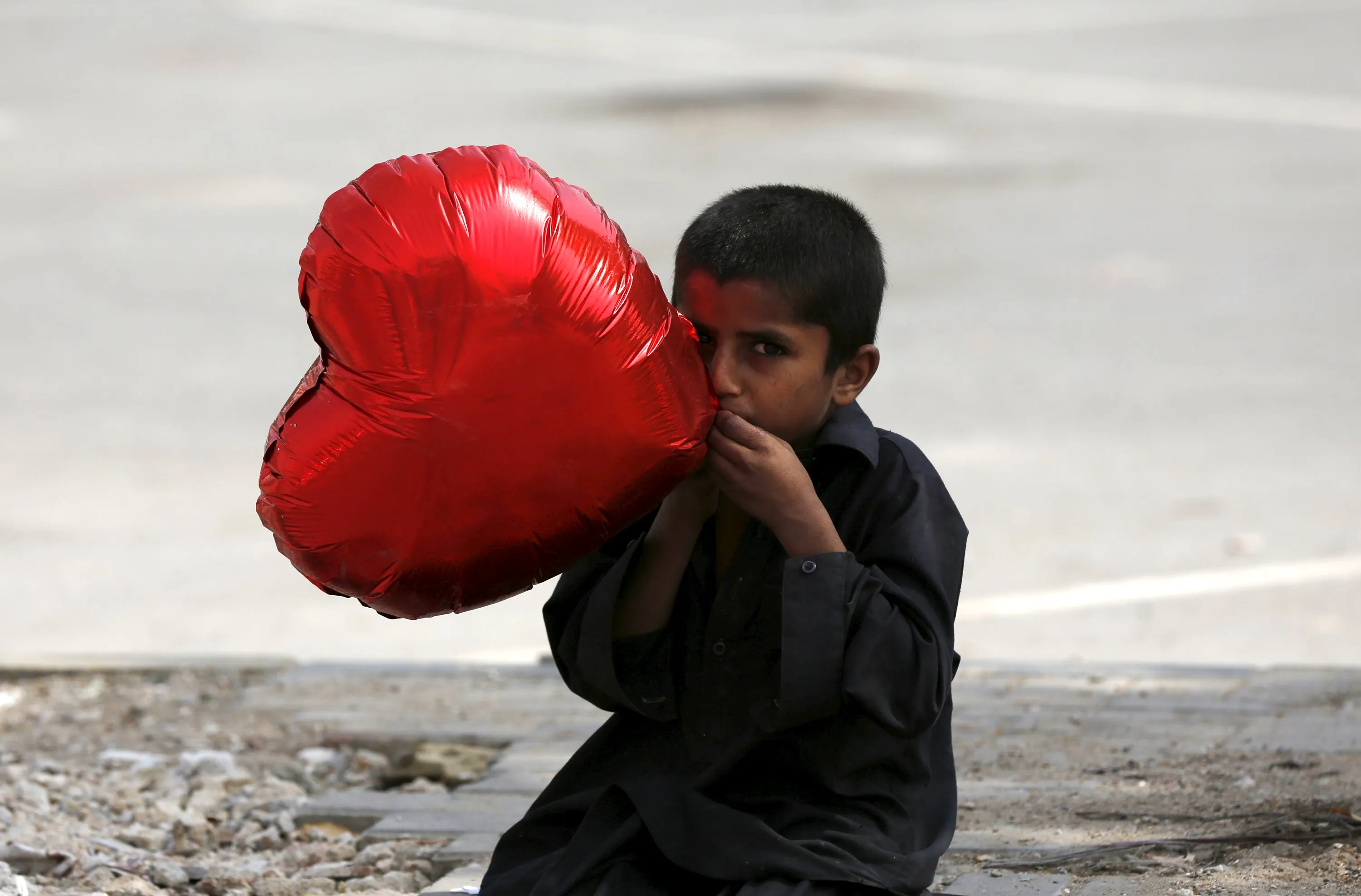 A boy inflates a heart-shaped balloon to sell on Valentine's Day in Karachi, Pakistan February 14, 2016. (Photo by Akhtar Soomro/Reuters)