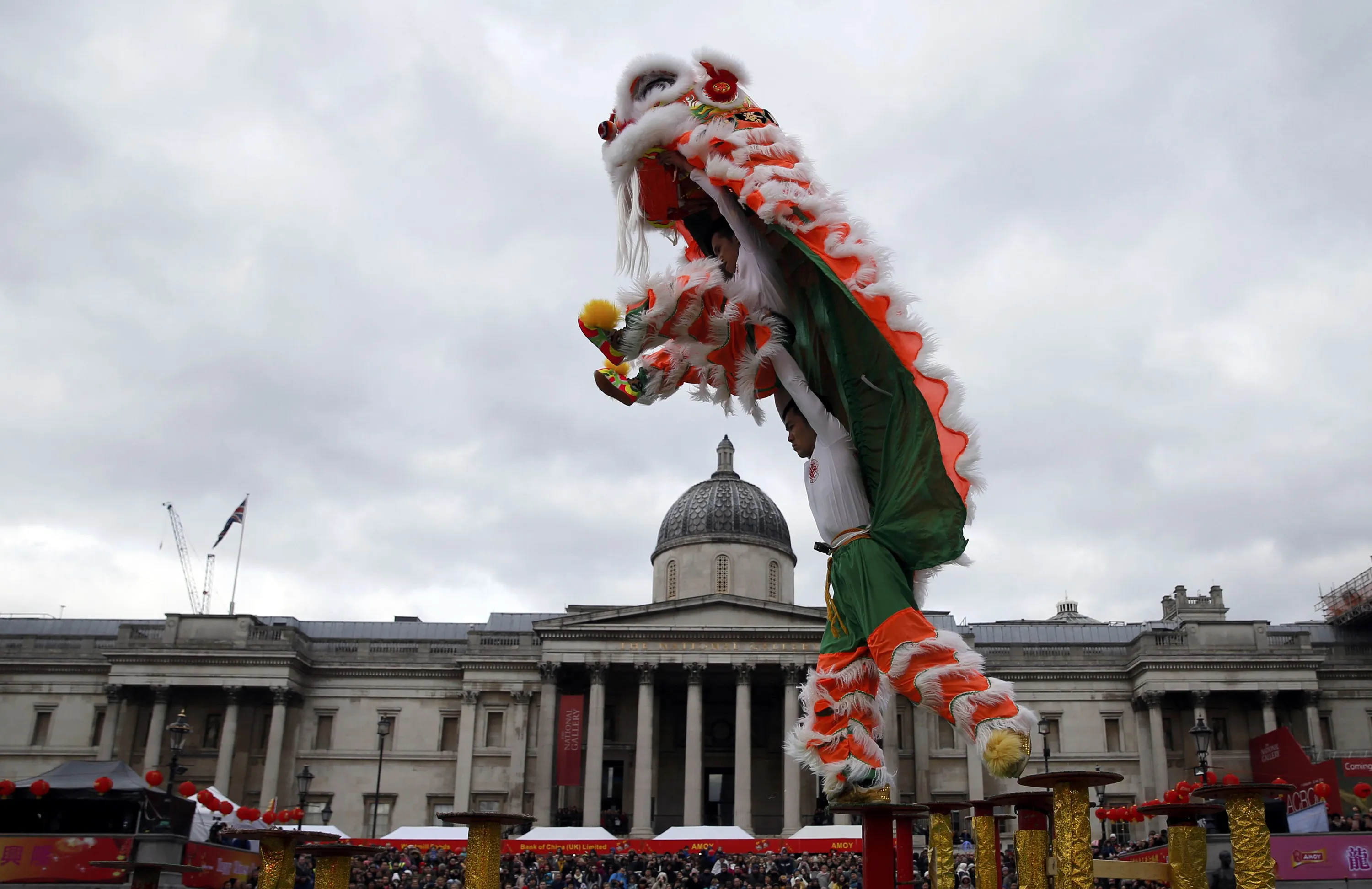 Performers wear a traditional costume to perform the “Flying Lion Dance” at an event to celebrate Chinese New Year in London, Britain February 14, 2016. (Photo by Neil Hall/Reuters)