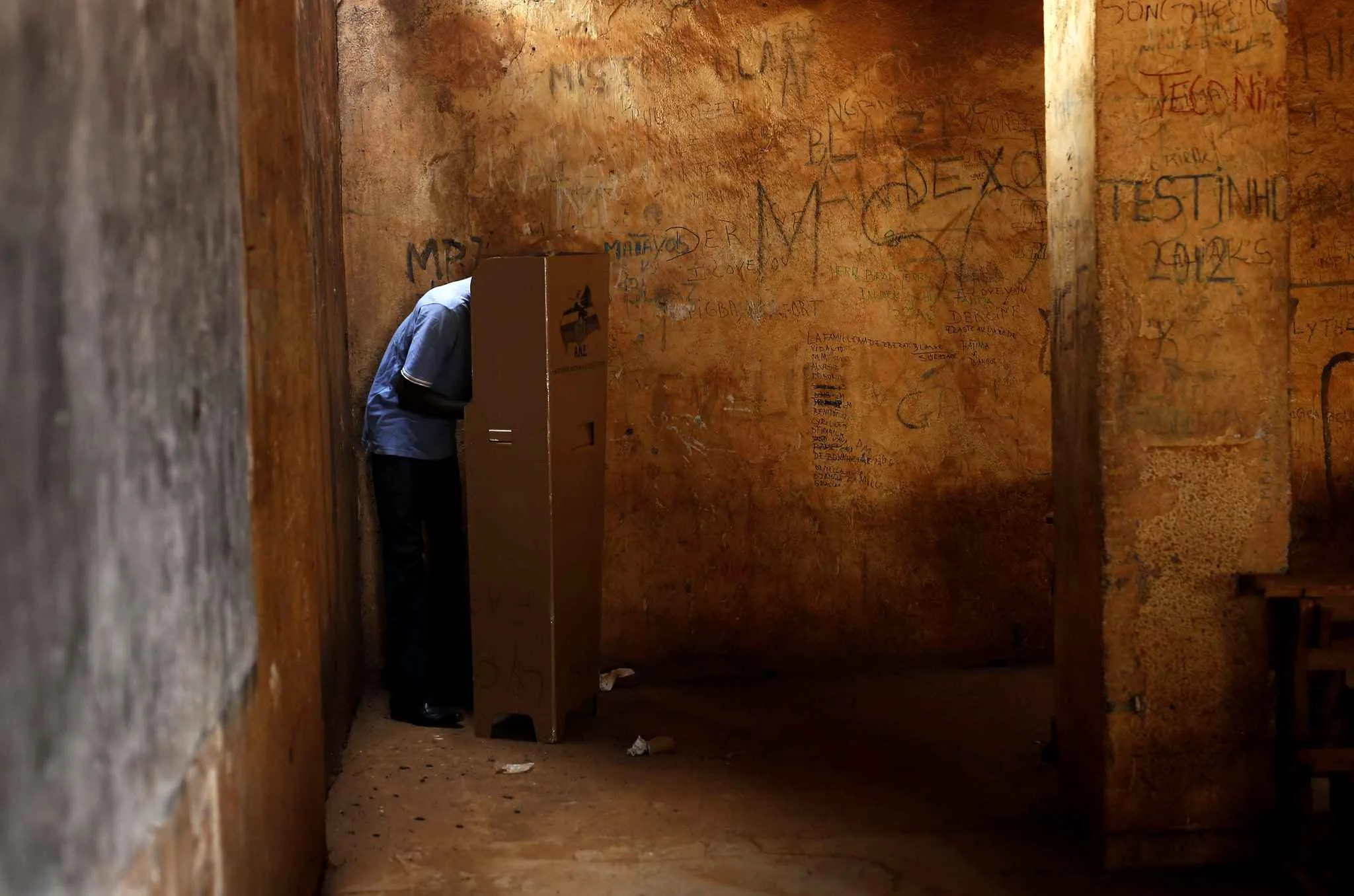 A man casts his ballot in the second round of presidential election and the first round of legislative elections in the Fatima district of Bangui, Central African Republic, Sunday February 14, 2016. Two former prime ministers, Faustin Archange Touadera and Anicet Georges Dologuele, are running neck-and-neck in the second round of presidential elections to end years of violence pitting Muslims against Christians in the Central African Republic. Central Africans will also vote in Legislative elections. (Photo by Jerome Delay/AP Photo)