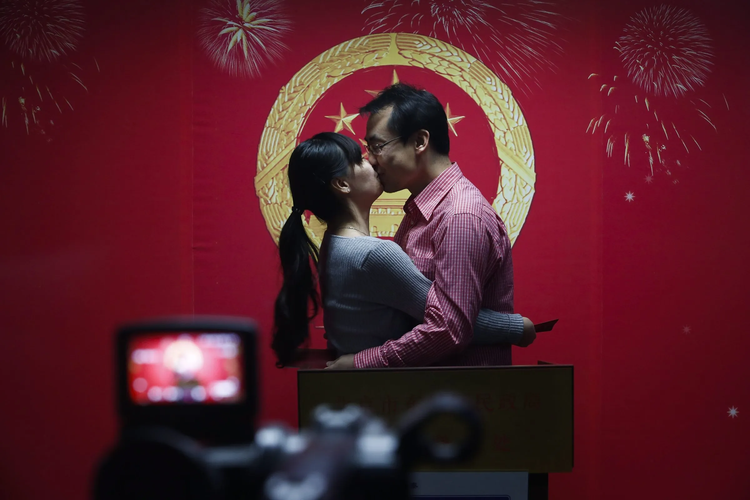 A Chinese couple kiss while being recorded on video during a symbolic ceremony of receiving marriage licenses on Valentine's Day at a marriage registry office in an eastern district of Beijing, China, 14 February 2016. Although celebrating 14 February as Valentine's Day is largely a foreign concept, many Chinese couples are beginning to embrace the idea as a novel day for couples in love to register for marriage. (Photo by Rolex Dela Pena/EPA)