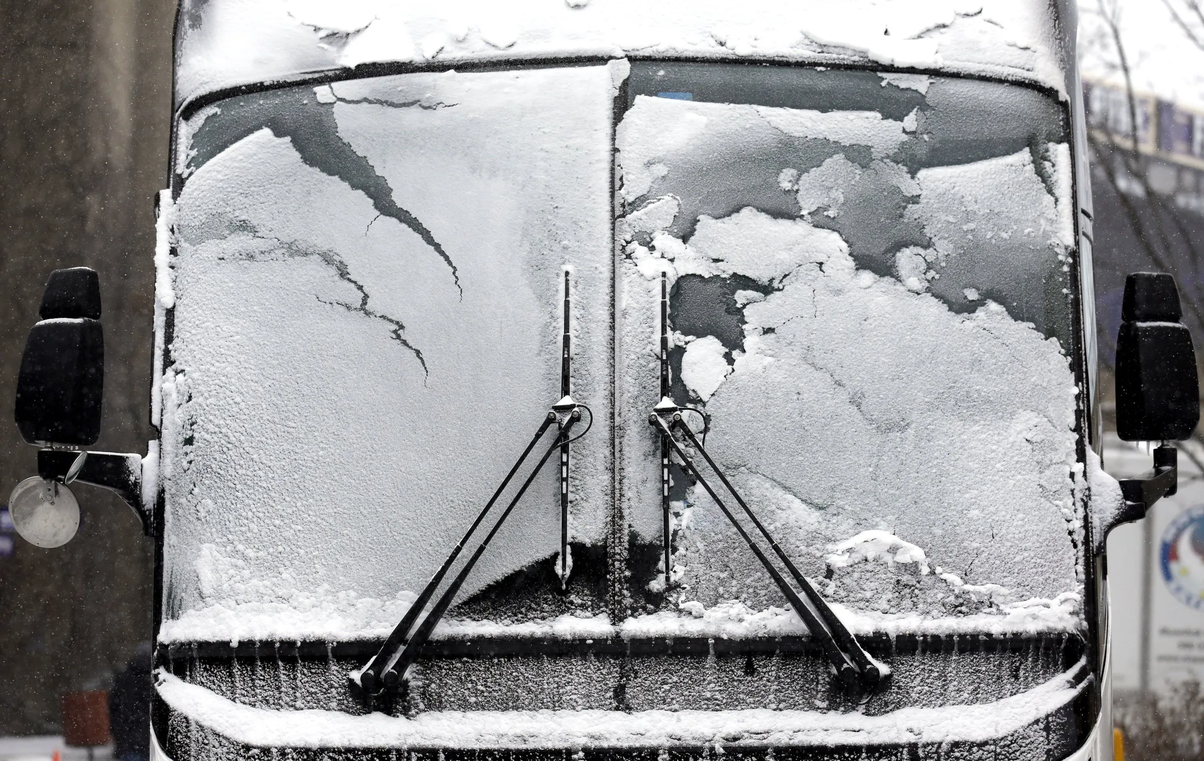 A bus window is covered by snow and ice, Sunday, February 14, 2016, in Evanston, Ill. Snow has now overspread nearly all of the Chicago Metro area early Sunday afternoon and is expected to continue into the night before ending. (Photo by Nam Y. Huh/AP Photo)